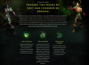 La classe Chasseur de démon fait son apparition dans la nouvelle extension ! Cette classe possède une spécialisation Tank et une spécialisation DPS. Cette classe ne sera jouable que par les Elfes de la nuit et les Elfes de sang. Il s'agit d'une classe corps à corps équipant du tissu ou du cuir.