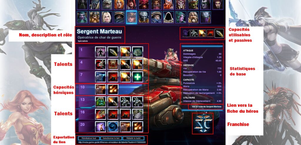 - Lien vers la fiche du héros : en cliquant sur ces liens, vous tomberez sur les pages des héros (elles existeront toutes bientôt), qui contiennent leur histoire, leurs skins, leurs quêtes et peut-être plus tard la liste de vos guides.