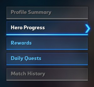 - Progression de héros : Cet onglet vous permet de faire le suivi des points d’expérience et des récompenses remportées par chaque héros. Il remplace l'onglet des quêtes de héros.