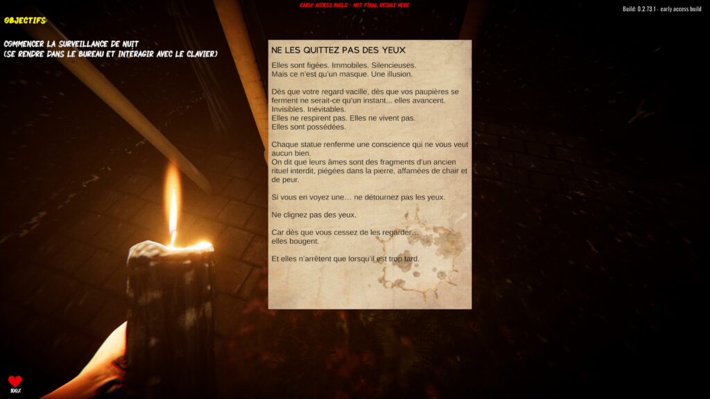 Heureusement, on peut trouver une bougie qui va faire office de lampe d'appoint le temps qu'elle dure, alors qu'on peut la recharger plusieurs fois en cliquant dessus... un vrai soulagement dans les ténèbres qui nous attendent dans cette foutue baraque. Les entités ont des comportements et des techniques différentes à chaque partie ce qui empêche les stratégies. Pour le moment, on n'a qu'une maison à visiter qui ne change cependant pas énormément.