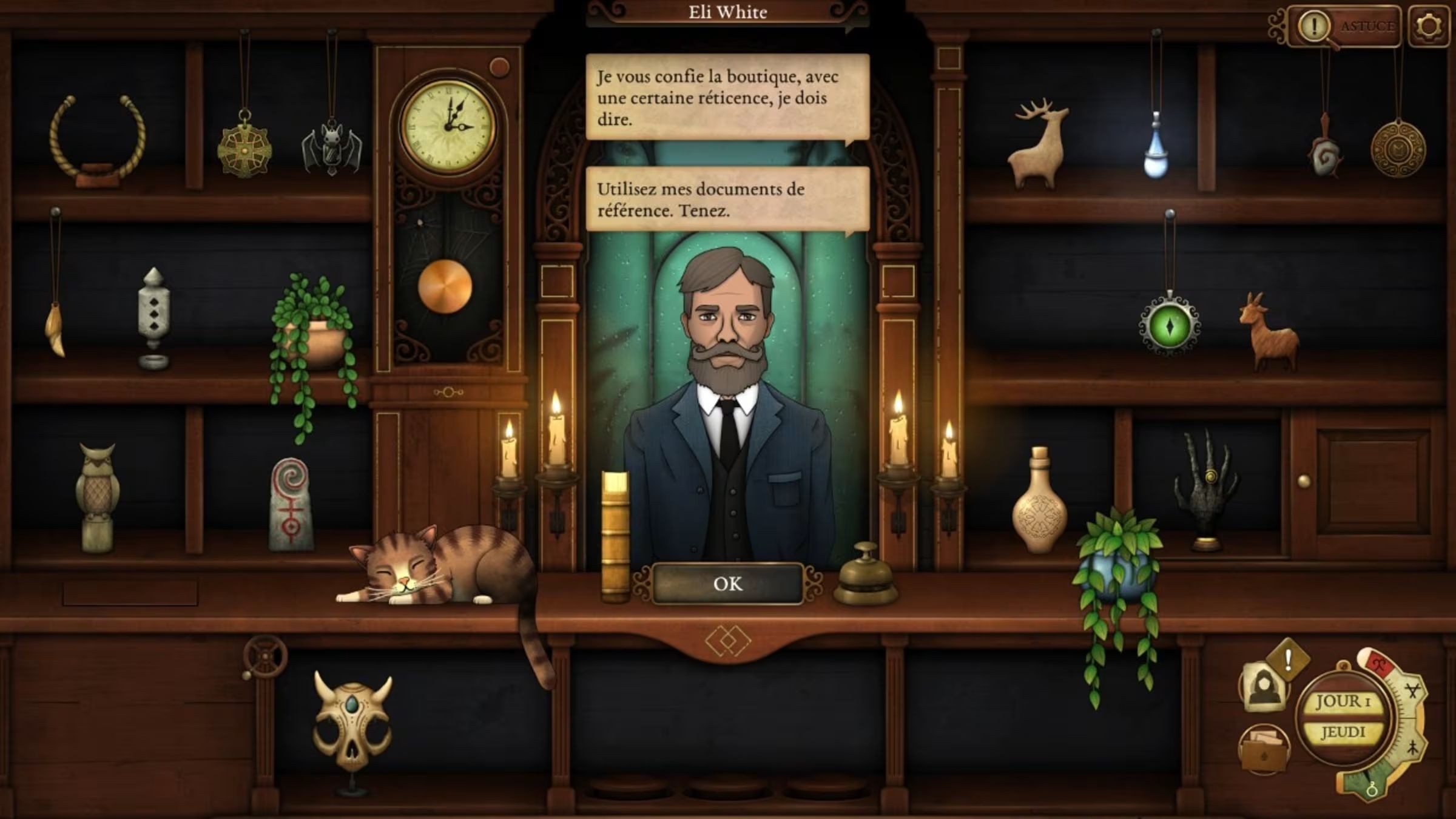 Le quotidien dans la boutique consiste à identifier des artefacts occultes, souvent en croisant les indices contenus dans votre grand grimoire et les requêtes de clients toujours plus biscornues. On assemble, bribe après bribe, les éléments permettant d'identifier et de satisfaire la requête d'un client, à travers les objets découverts et les bribes de dialogues. Suggérer le bon objet au bon client est plus affaire de déduction que de hasard, et l’erreur se paie via une peur grandissante qui s'empare de votre personnage, avec une légère sanction qui s'en va dès lors que vous parviendrez à résoudre quelques énigmes.
