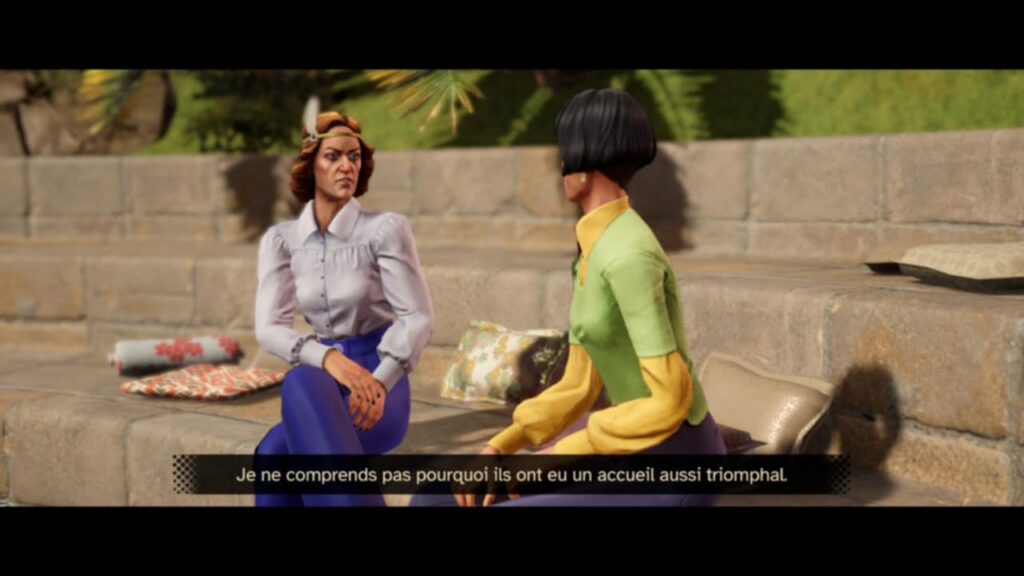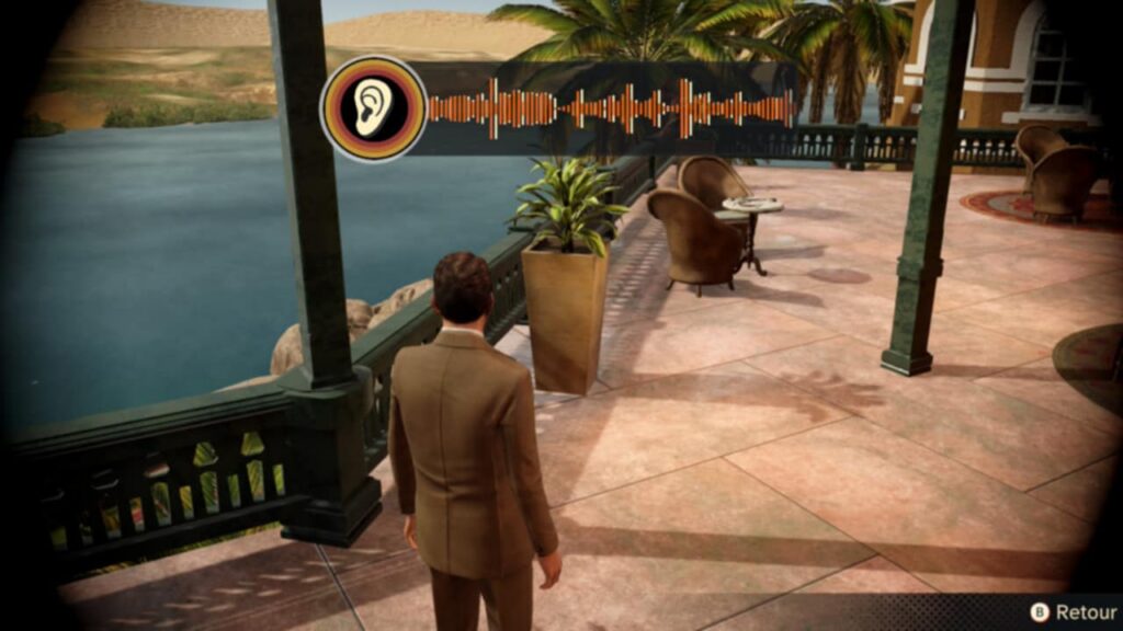 D’un point de vue visuel, Mort sur le Nil mise davantage sur son identité artistique que sur la démonstration technique. Les décors restituent parfaitement l’atmosphère feutrée d’un huis clos à la Christie. On sent une vraie cohérence dans la direction artistique, même si les textures et animations restent assez simples et n’atteignent jamais le niveau des productions AAA. Cela dit, l’ambiance sonore apporte une vraie valeur ajoutée : la bande originale, discrète et élégante, souligne les moments de tension sans jamais les étouffer, tandis que les doublages donnent vie aux personnages avec justesse. Les sous-titres français, clairs et bien intégrés, permettent à tous de profiter pleinement de l’intrigue. Un écrin sobre mais efficace, qui sert avant tout l’immersion narrative.
