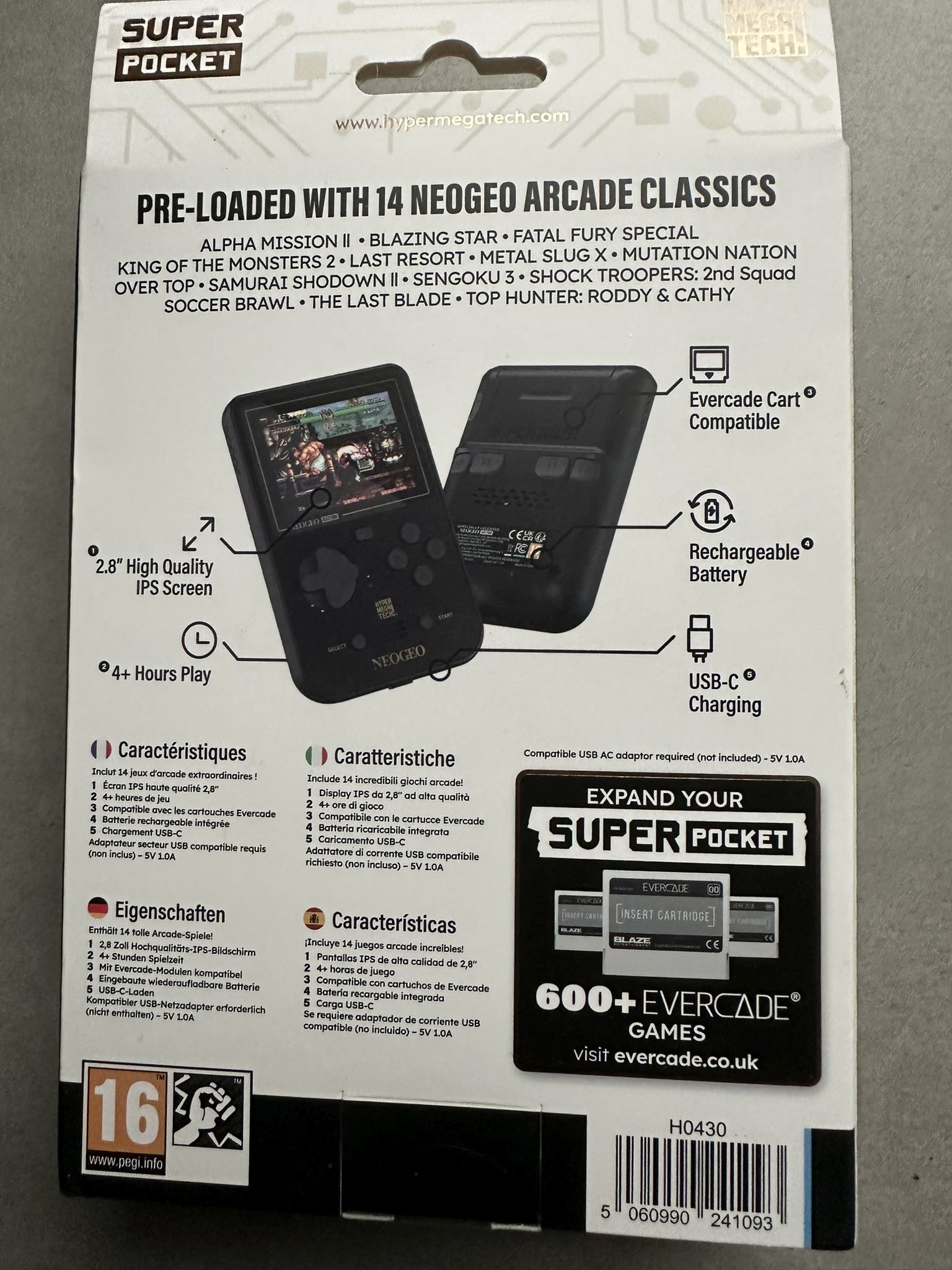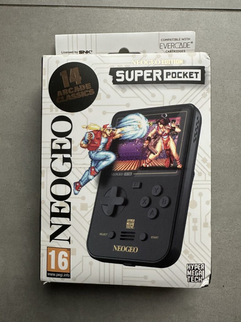 La Super Pocket Neo Geo Edition est le dernier prolongement de la gamme Evercade initiée par Blaze Entertainment. Développée par la marque associée HyperMegaTech!, elle se distingue par un partenariat officiel avec SNK qui permet de proposer une sélection de jeux Neo Geo dans un format portable compact.