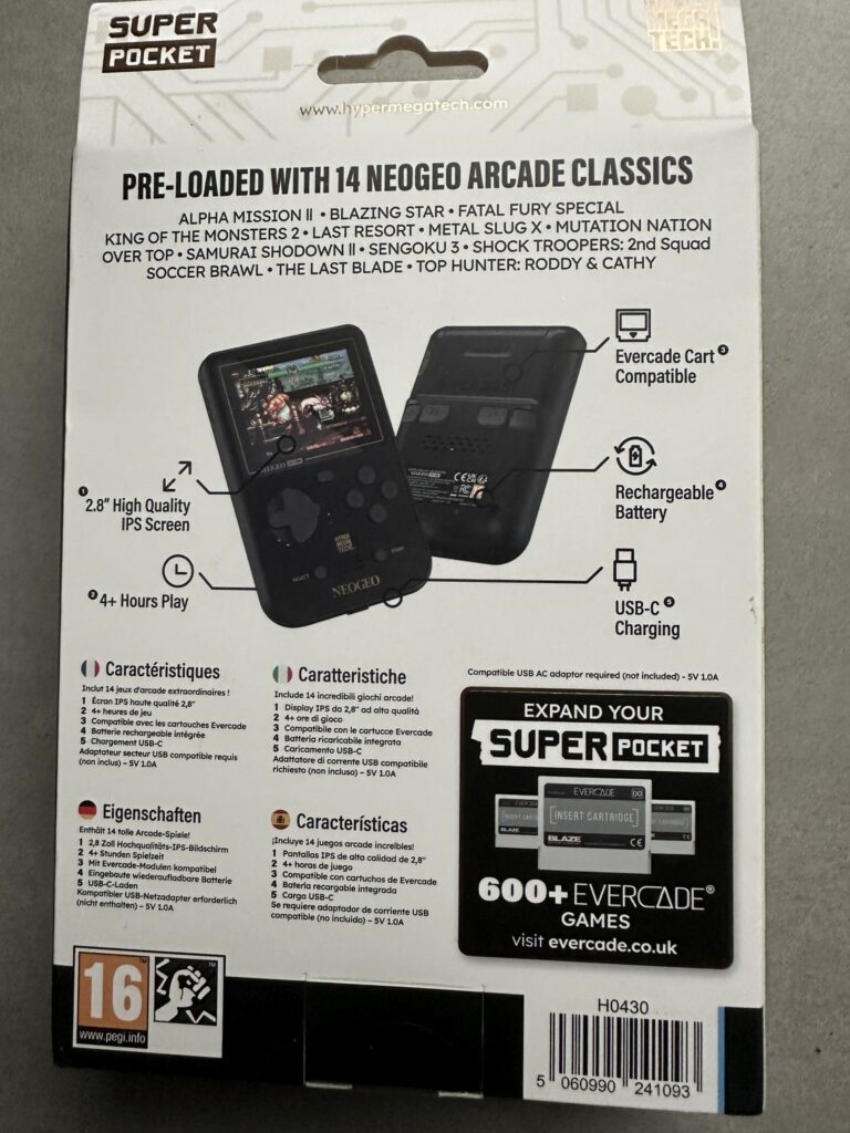 L’ergonomie reprend les grandes lignes des autres Super Pocket : croix directionnelle, quatre boutons principaux, boutons de tranche plus discrets. Le format reste pensé pour une utilisation simple et immédiate, sans recherche de compatibilité avec des productions modernes. Comparée à l’Evercade EXP, qui dispose d’un écran plus grand, d’un réglage de luminosité et d’un mode vertical rotatif, la Super