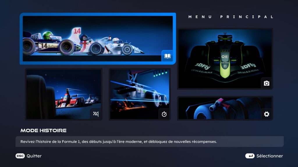 Le jeu propose principalement deux modes : la course personnalisée et le contre‑la‑montre. Les classements en ligne permettent de comparer ses performances, mais il n’existe pas encore de véritables compétitions multijoueurs. L’essentiel reste centré sur l’expérience individuelle, l’amélioration de ses propres chronos et la stratégie choisie en fonction des conditions. Cela correspond à l’esprit du jeu, pensé comme une progression personnelle à travers les décennies de la monoplace.