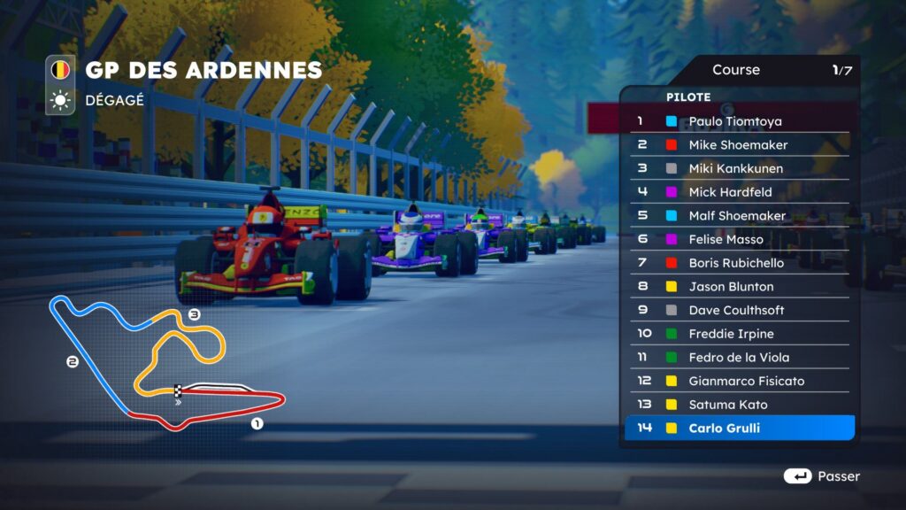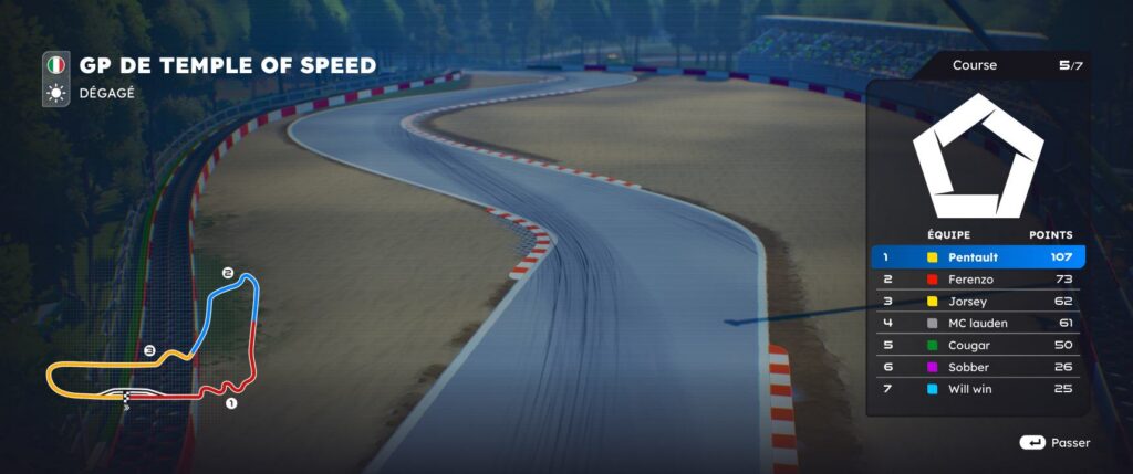 Graphiquement, Formula Legends adopte un style stylisé qui ne cherche pas le réalisme absolu. Les lignes sont épurées, les couleurs distinctes, l’interface claire. Cette direction artistique évoque davantage une ambiance qu’une reproduction photographique, et en course cela se traduit par une lisibilité immédiate, sans surcharge. La fluidité de l’affichage rend les longues sessions agréables et met en valeur le travail sur l’identité de chaque voiture et de chaque circuit.