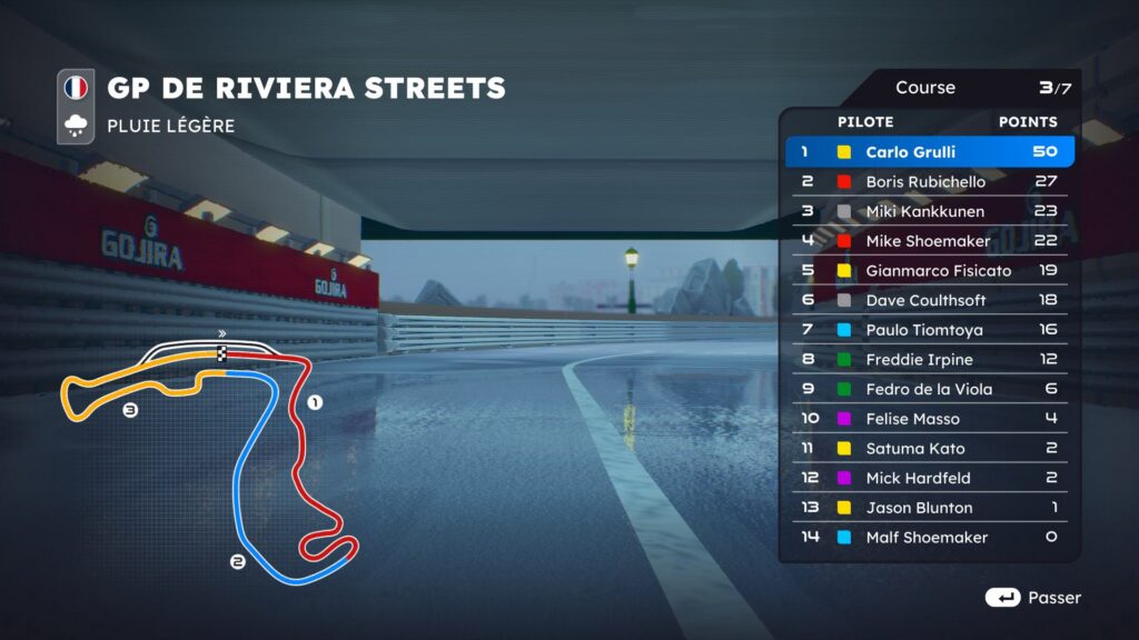 Le contenu proposé est vaste et structuré autour de seize voitures différentes, chacune déclinée en plusieurs livrées, et plus de deux cents pilotes aux compétences particulières. Certains pilotes sont plus efficaces sous la pluie, d’autres réduisent le temps d’arrêt aux stands, ce qui change la manière d’aborder une course. Les quatorze circuits disponibles proposent des tracés modernes et des variantes historiques, donnant l’impression de voyager dans le temps tout en restant concentré sur la course.