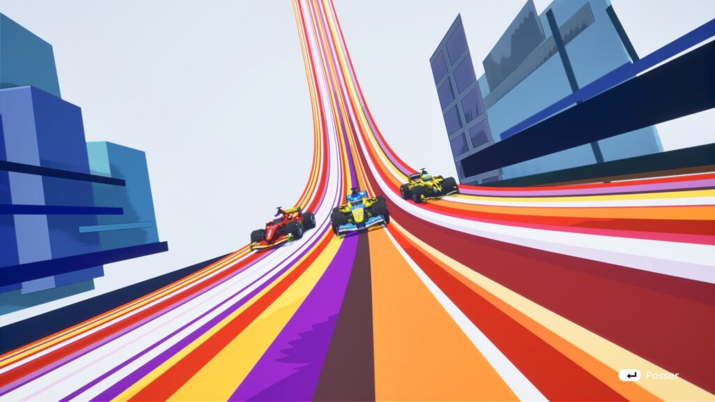 Graphiquement, Formula Legends adopte un style stylisé qui ne cherche pas le réalisme absolu. Les lignes sont épurées, les couleurs distinctes, l’interface claire. Cette direction artistique évoque davantage une ambiance qu’une reproduction photographique, et en course cela se traduit par une lisibilité immédiate, sans surcharge. La fluidité de l’affichage rend les longues sessions agréables et met en valeur le travail sur l’identité de chaque voiture et de chaque circuit.