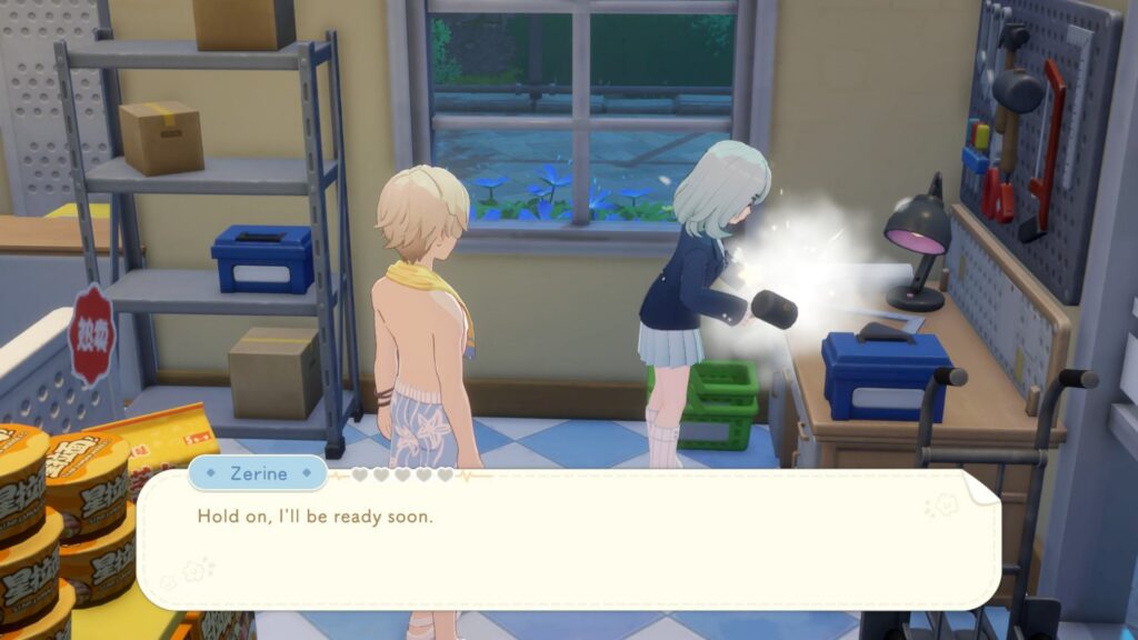 J'enchaîne, je passe discuter avec une spécialiste de l'artisanat, qui m'apprend à construire mon premier véhicule, une planche à roulettes. La maniabilité n'est pas évidente, j'ai subi de gros crashs, car il se bloque sur les escaliers ou les petites bosses. Je ne m'en sers que dans les lignes droites, ou alors je prends un chemin plus long, histoire de rester sur les routes.