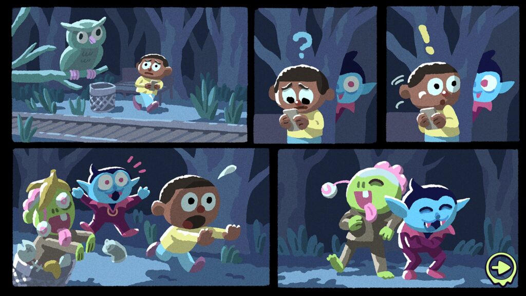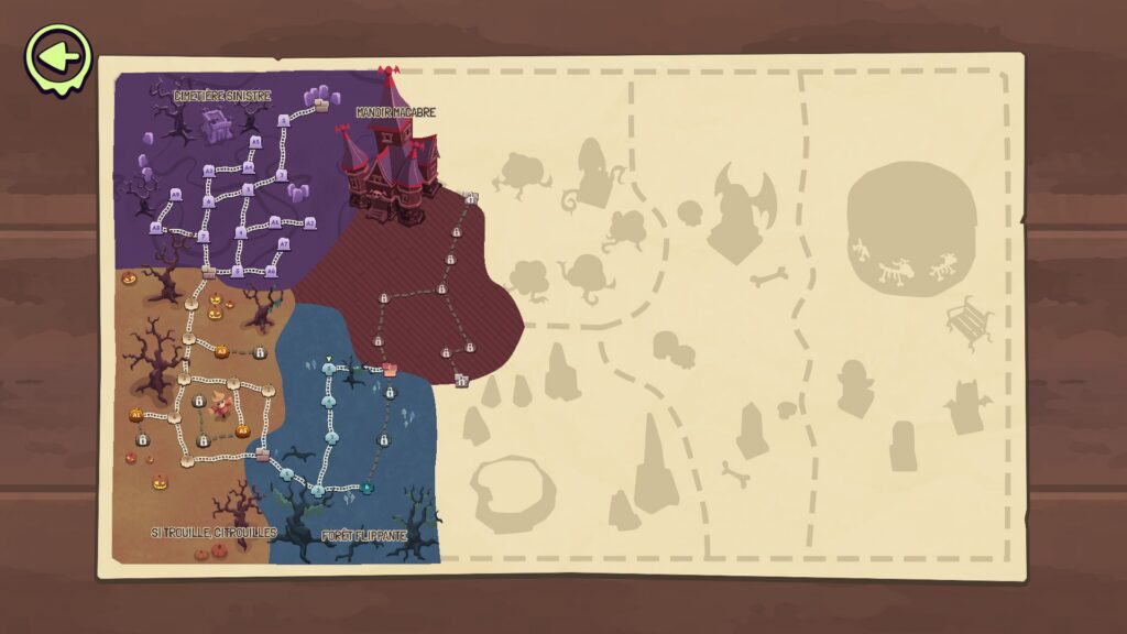 Point de système d'étoiles ici pour récompenser notre optimisation de tracé. Il faut juste terminer le niveau et s'attaquer aux trajets optionnels (et bien plus retors) si le cœur nous en dit. Les niveaux sont répartis dans différents univers qui assurent un peu de variété en terme de décors. Cimetière, champ de citrouilles, manoir hanté, etc... tout se renouvelle assez vite pour éviter qu'on se lasse. Régulièrement, on est récompensé avec de toutes petites BD toute mignonnes qui prêtent à sourire.