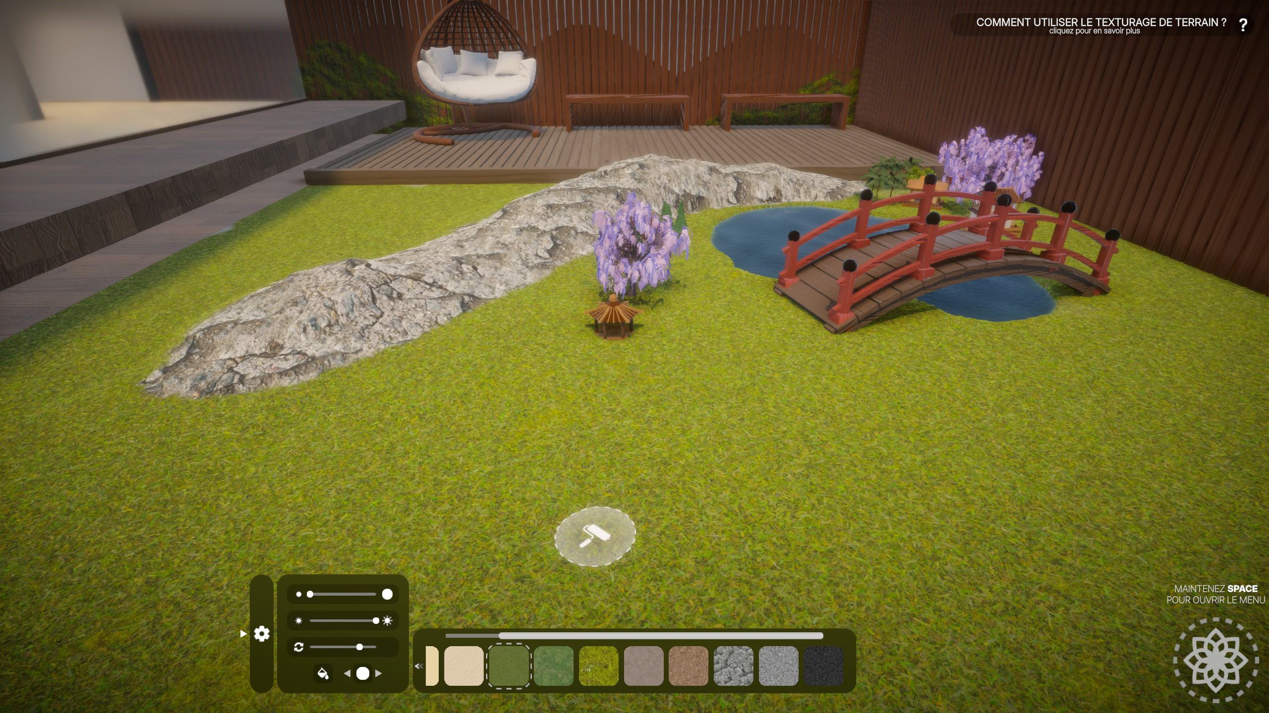 Le placement d'articles est l'endroit où j'ai passé le plus de temps, avec une bonne centaine d'objets différents, organisés en six catégories. Les cinq premières sont "classiques" : objets (lumières, bâtiments, statues, passerelles, chemins, barque, kiosque, balançoire...), pierres, plantes, arbres et animaux. Le sixième apporte des effets : lucioles, papillons, brouillard et jet d'eau.