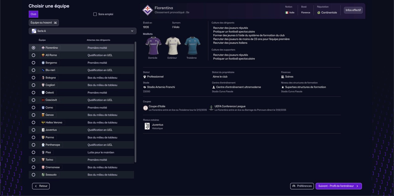 Ce test sera, comme pour chaque incursion dans la licence, une plongée au cœur de ma propre partie. Je me suis lancé dans l'aventure et j'arrive à mi-parcours de ma première saison, avec l'excitation des débuts et la frustration des matchs cruciaux. Fidèle à mes parties de prendre des équipes en difficulté, mon choix s'est porté sur la Fiorentina. La Viola, ce nom mythique qui résonne avec tant d'exploits passés, peine désormais à retrouver son éclat d'antan en Serie A. Mon objectif est clair : les ramener là où ils appartiennent, au sommet du football italien, et pourquoi pas, européen !