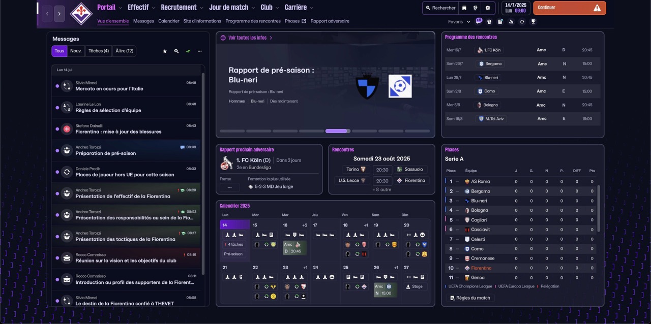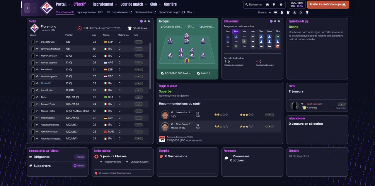 Mon premier jour à Florence fut une immersion totale. Le président m'a accueilli, exposant la situation du club : délicate, comme on pouvait s'y attendre pour une équipe de Serie A en quête de renouveau. Les objectifs sont ambitieux : viser une place européenne. Les moyens financiers sont, eux, plutôt limités, mais je ferai avec. C'est un défi de taille pour un club de ce calibre, mais c'est aussi ce qui rend Football Manager si addictif. Les échanges avec le staff ont suivi, un aspect que j'apprécie toujours autant. Écouter leurs retours sur l'effectif, comprendre les dynamiques de groupe, sentir les potentielles zones de friction. Un joueur malheureux, c'est un point de moins sur le terrain, et ça, FM26 le gère avec toujours autant de finesse. Et bien sûr, l'incontournable première interview avec la presse, où il faut essayer de ne pas se les mettre à dos. Ces interactions, toujours plus riches et nuancées, sont le sel du jeu.