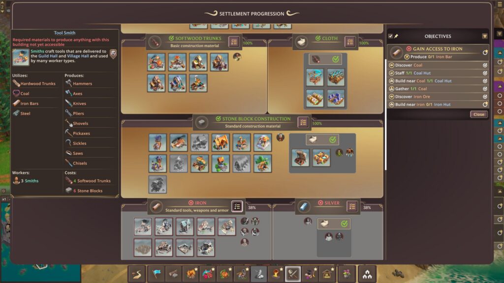 En parallèle de tout ça, la version 1.0 apporte plusieurs améliorations de confort. Les bûcherons et chasseurs ont plus d’options, les transporteurs peuvent désormais livrer des ressources hors du territoire, la mini-carte est plus lisible grâce à de nouveaux filtres, et les infobulles des ressources s’enrichissent de liens rapides renvoyant directement vers les bâtiments associés.