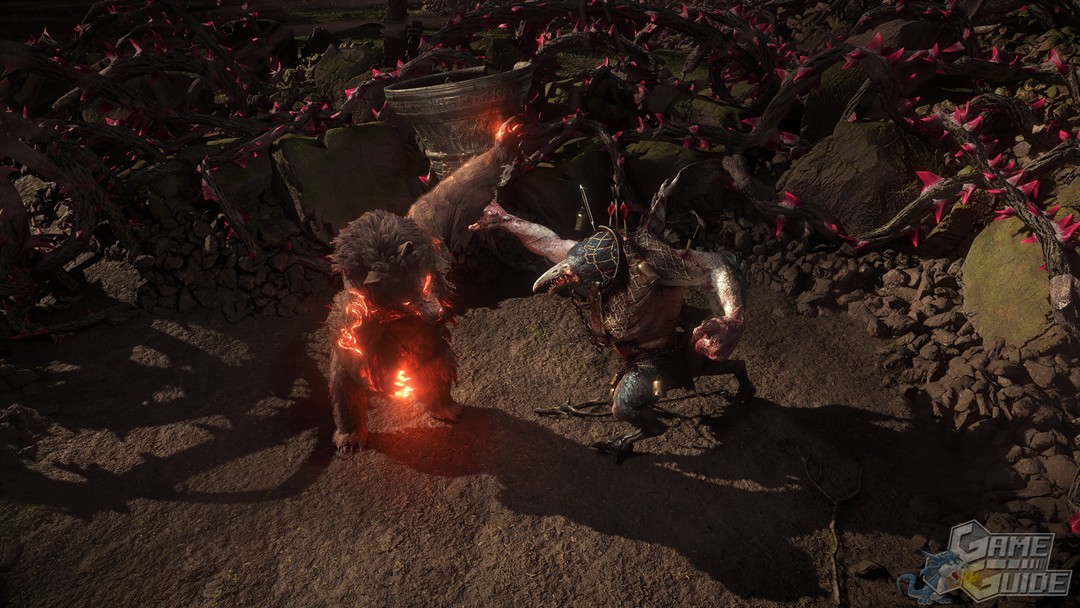 Mais ce qui est vraiment intéressant avec le druide, c'est son arme : une sorte de talisman qui permet de vous transformer en créatures parmi trois : l'ours, qui utilise un système de rage pour renforcer ses attaques, le loup garou, personnage bien plus vif et agile que la force lourde et implacable de l'ours et la wyverne, créature capable d'attaquer à distance avec des flammes et de voler.