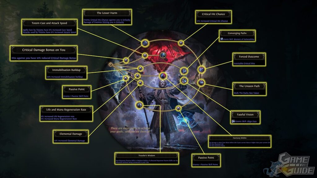 La classe de base et chacune des 2 spécialisations possèdent un arbre de compétences propre avec 139 passifs disponibles et 32 nouvelles gemmes de soutien.