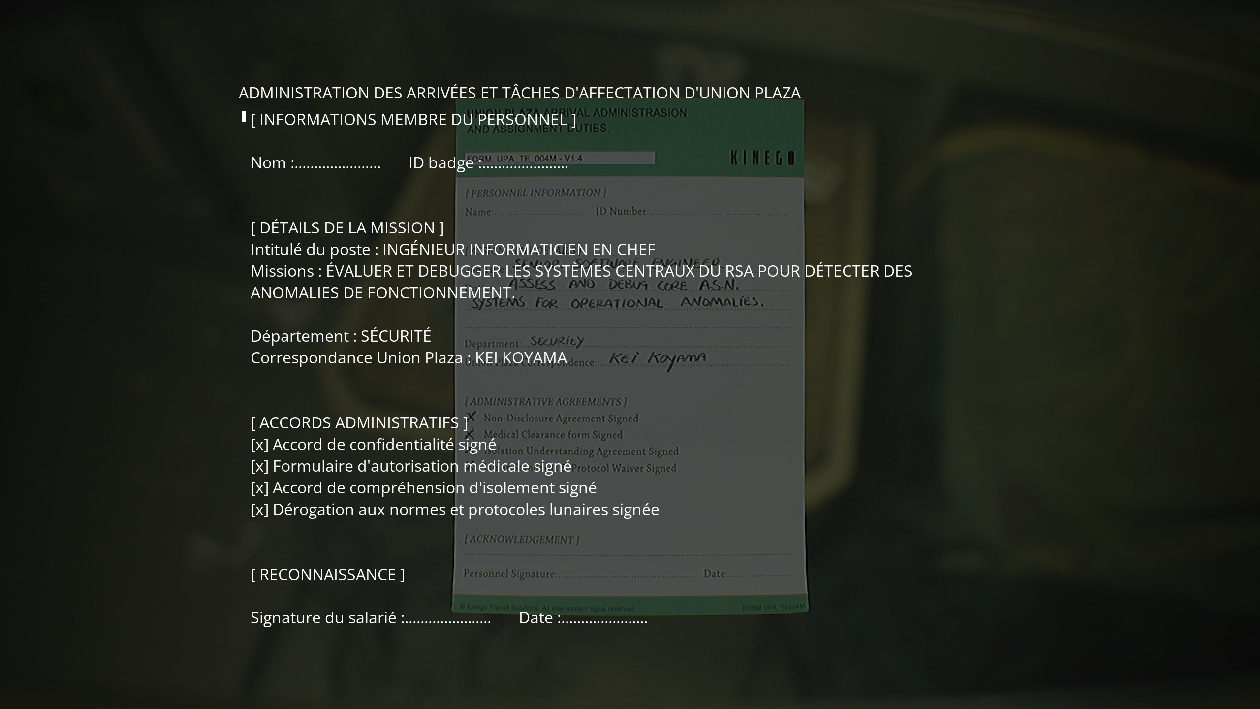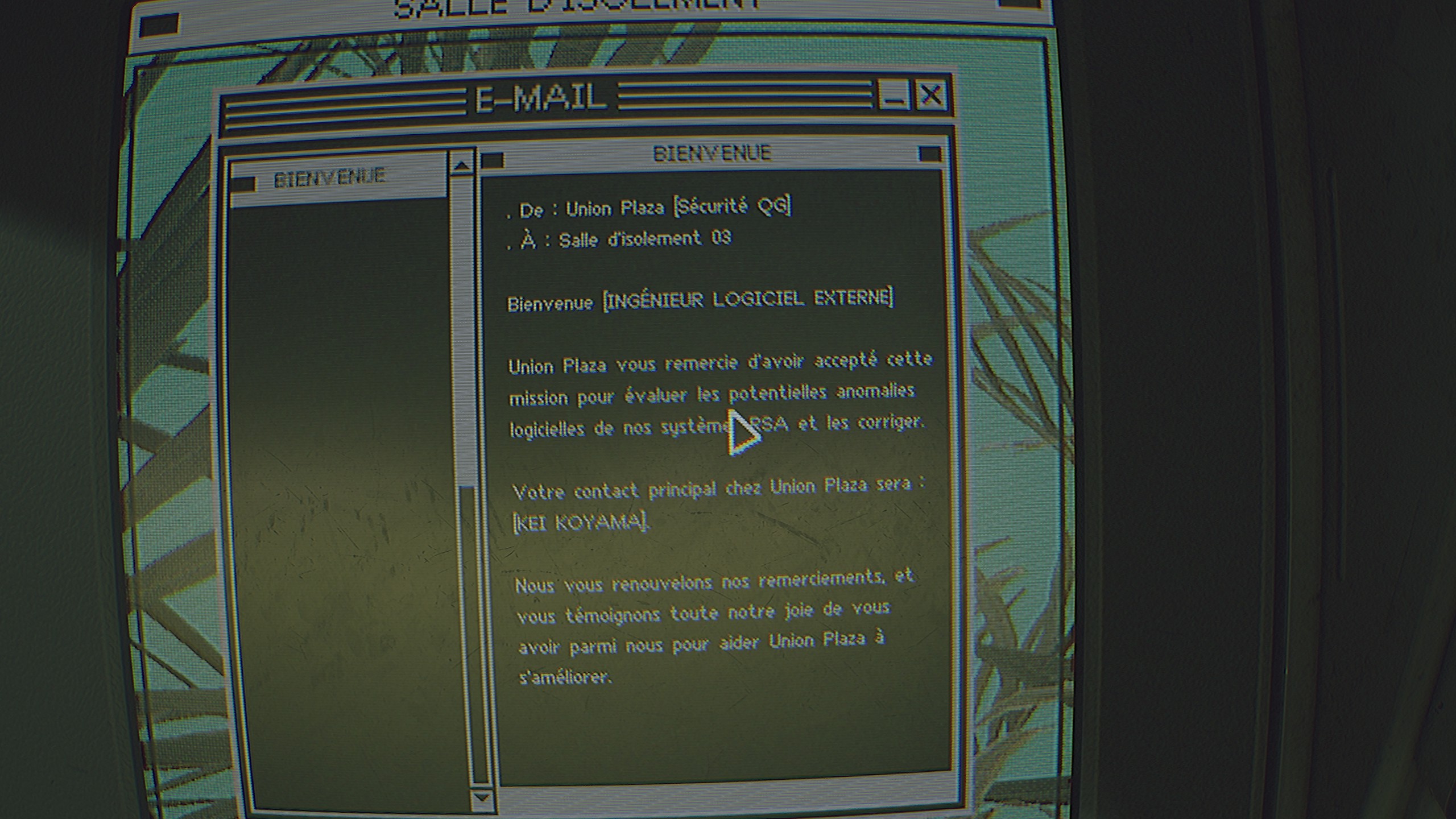 Déjà, une chose très claire : le jeu ne nous prend pas par la main à nous montrer des directions en nous disant quoi faire et en affichant des objectifs. TOUT le jeu nous donnera des indications par moments, avec des messages sur des écrans, des notes écrites, etc... mais rien de plus. Tout comme l'interface qui est totalement absente : on aura juste de temps en temps un menu via notre outil qui se connecte aux panneaux qui s'affichent sur les points d'accès ici et là.