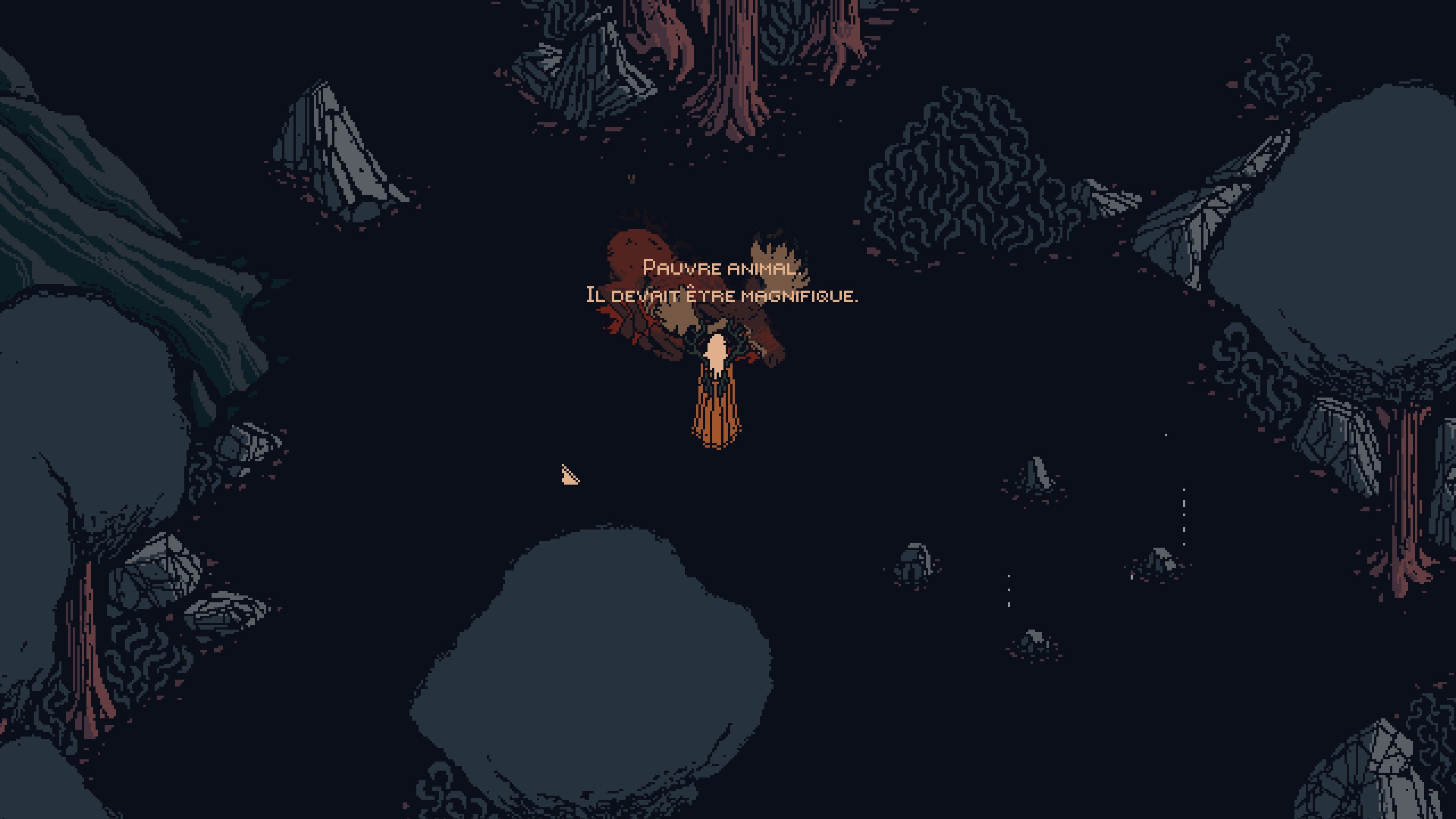 D'autant que s'il y a un point sur lequel Death Howl ne déçoit pas, c'est sur son aspect visuel. On a ici un petit chef-d'œuvre tout en pixel art sombre, jouant avec des noirs abyssaux, des décors lugubres et des silhouettes inquiétantes, le tout dans un folklore scandinave tordu. L'atmosphère est oppressante : la mort et le deuil suivent Ro dans sa quête désespérée, explorant la maternité, la fragilité de la vie et l'acceptation du deuil. C'est brut, mais ça fonctionne à merveille.