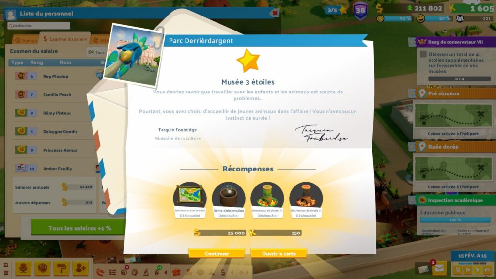 La difficulté n'est pas très élevée, globalement c'est un peu le reproche que je fais à Museum et qui se poursuit ici. Il n'y a pas un équilibre ultra précis à trouver, avec même des salles à allumer ou éteindre en fonction de la demande comme dans Hospital. Tant qu'il n'y a pas trop d'employés surpayés, que les salles primordiales sont installées (cafétéria, toilettes, repos, formation...), et que les éléments sont mis en valeur, les visiteurs viennent et dépensent.