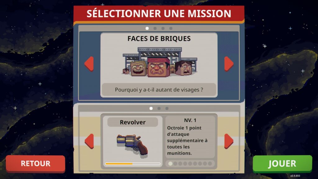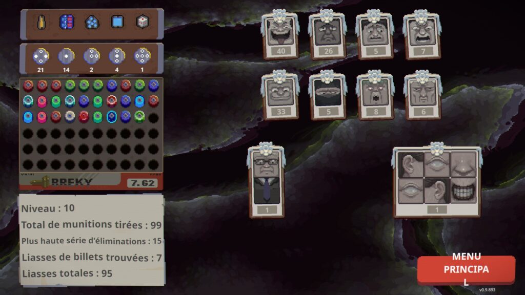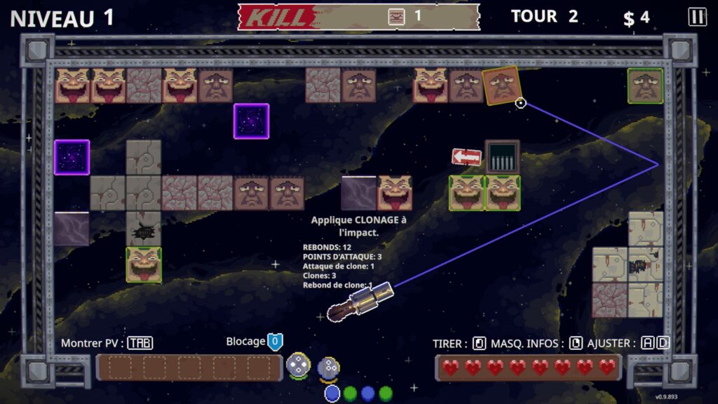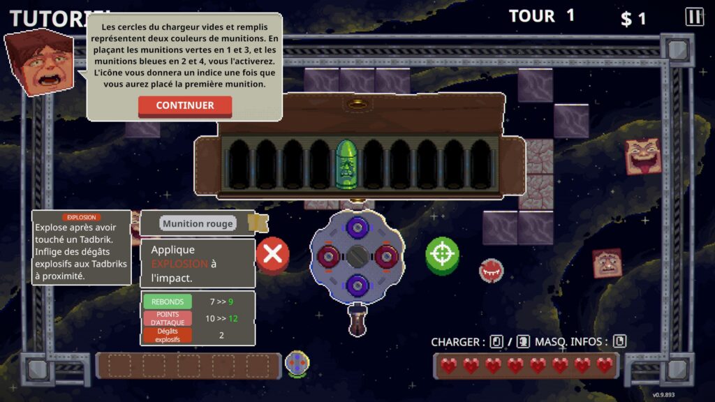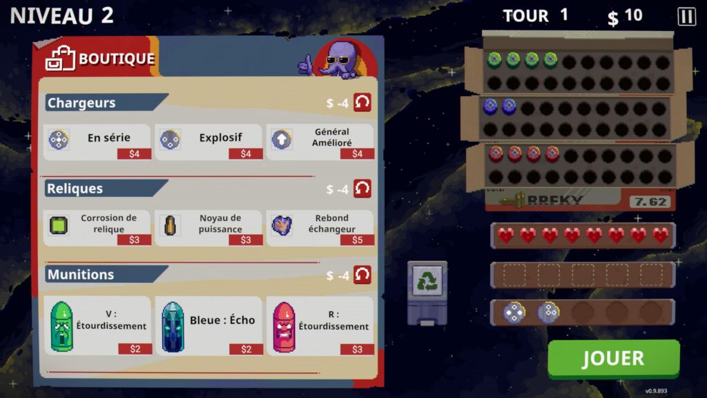 L'idée est très bonne et oblige quelques choix stratégiques via l'échange de balles qui nous fait sacrifier une balle en échange d'une autre. Il y a trois couleurs : balles rouges, balles bleues, balles vertes, avec des effets sur chaque balle comme une explosion, un effet corrosif, une démultiplication. On peut d'ailleurs augmenter la puissance dans la boutique après chaque manche en achetant de nouveaux chargeurs, des reliques qui donnent des effets puissants, ou différentes balles.