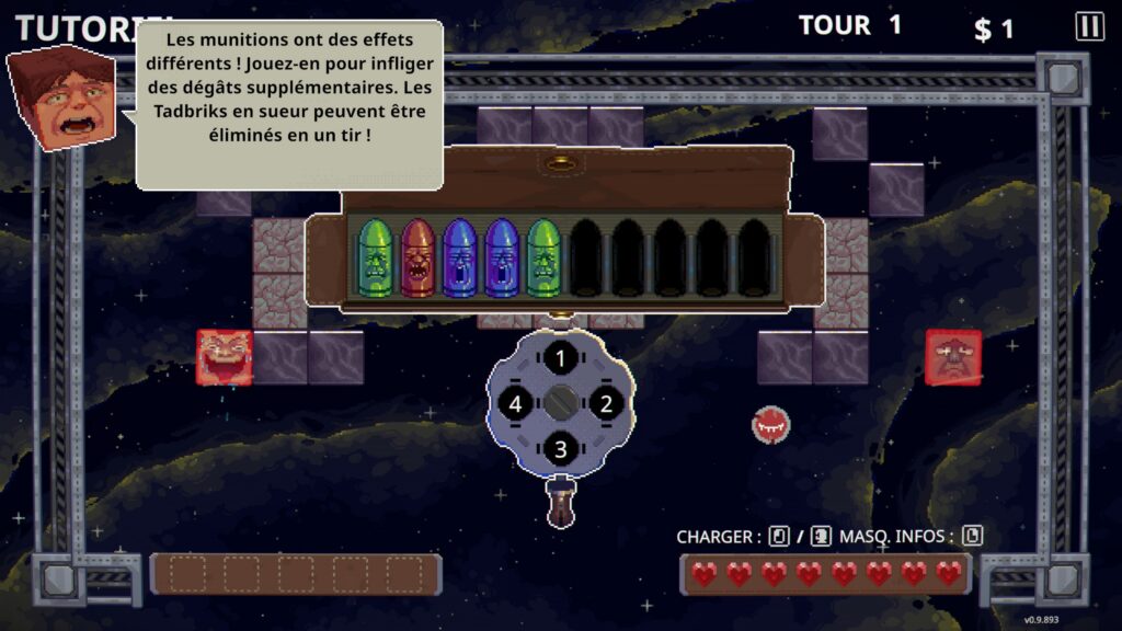 Un rapide tuto nous montre et nous explique le principe du jeu qui est ma foi assez simple dans son principe : on tire sur les ennemis jusqu'à ce qu'ils claquent, sachant qu'on ne peut charger que le nombre de balles que l'on a dans notre réserve. Cependant, nos chargeurs possèdent des capacités très particulières qui peuvent changer la donne : plus de répond, plus de puissances, différents effets, et pour les activer, il suffit de suivre les schémas proposés !