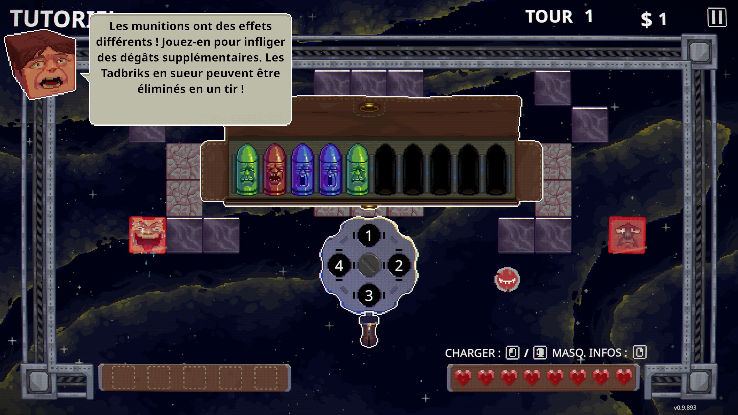 Un rapide tuto nous montre et nous explique le principe du jeu qui est ma foi assez simple dans son principe : on tire sur les ennemis jusqu'à ce qu'ils claquent, sachant qu'on ne peut charger que le nombre de balles que l'on a dans notre réserve. Cependant, nos chargeurs possèdent des capacités très particulières qui peuvent changer la donne : plus de répond, plus de puissances, différents effets, et pour les activer, il suffit de suivre les schémas proposés !