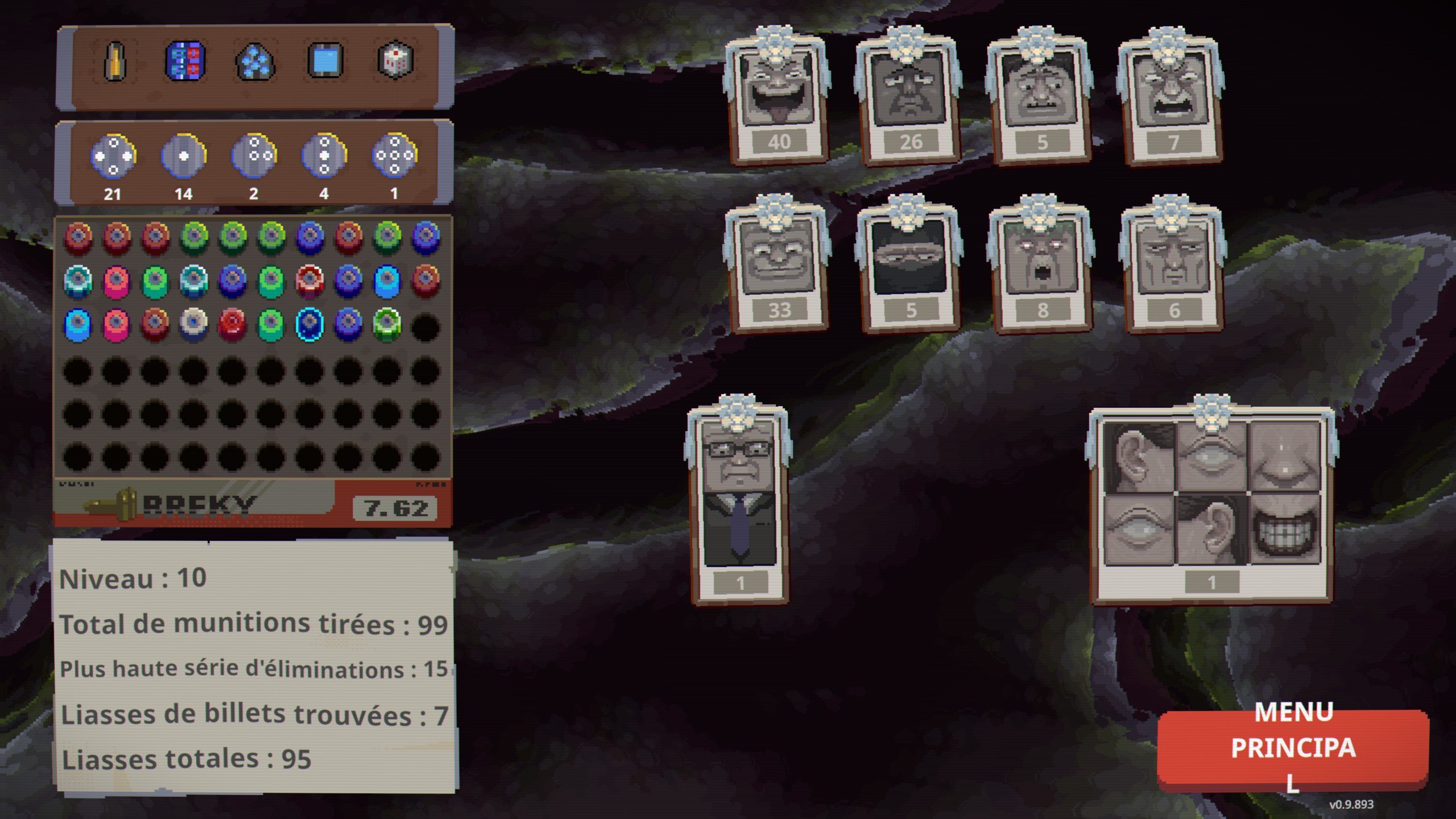 L'idée est très bonne et oblige quelques choix stratégiques via l'échange de balles qui nous fait sacrifier une balle en échange d'une autre. Il y a trois couleurs : balles rouges, balles bleues, balles vertes, avec des effets sur chaque balle comme une explosion, un effet corrosif, une démultiplication. On peut d'ailleurs augmenter la puissance dans la boutique après chaque manche en achetant de nouveaux chargeurs, des reliques qui donnent des effets puissants, ou différentes balles.