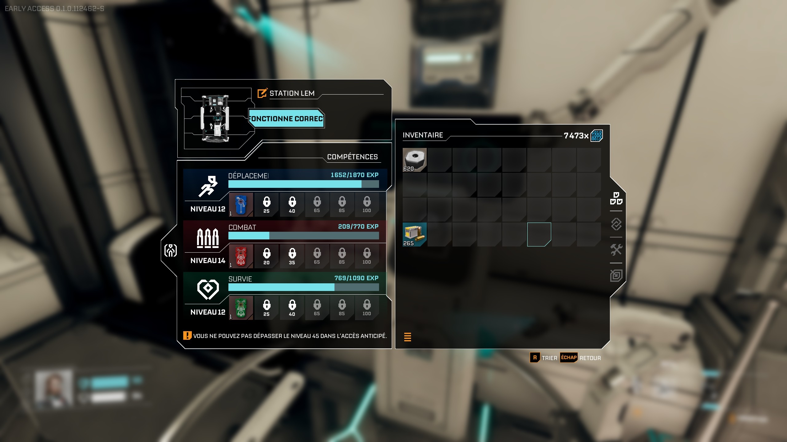 Ces points vont nous débloquer du matériel tel que les armes, les soins, de nouvelles constructions ou recettes. Cela se couple avec les différentes machines qui permettent d'analyser les ressources pour gagner des points ou bien d'autres qui débloqueront des recettes avec des composants que l'on fabrique. Parfois cela demandera d'aller en extérieur pour trouver des plantes, des morceaux de créatures ou des minéraux.