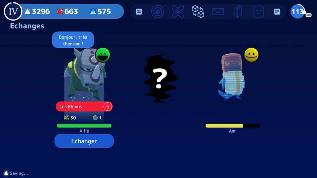 De plus, un arbre des technologie nous aidera, car deux types de points (gris et bleu pour ne pas perdre les lecteurs) vont aider. Les gris vont permettre les montées en niveau et vont servir pour faire des villageois, et l'autre sera pour acheter des évolutions de science qui donneront des bonus significatifs. Chaque palier se débloque en fonction de nos actions et personnages, ainsi qu'avec le temps qui passe. Cela peut être long et fastidieux sur la fin, mais on peut s'occuper en optimisant les zones, en trouvant de nouvelles planètes ou simplement en s'occupant des autres factions.