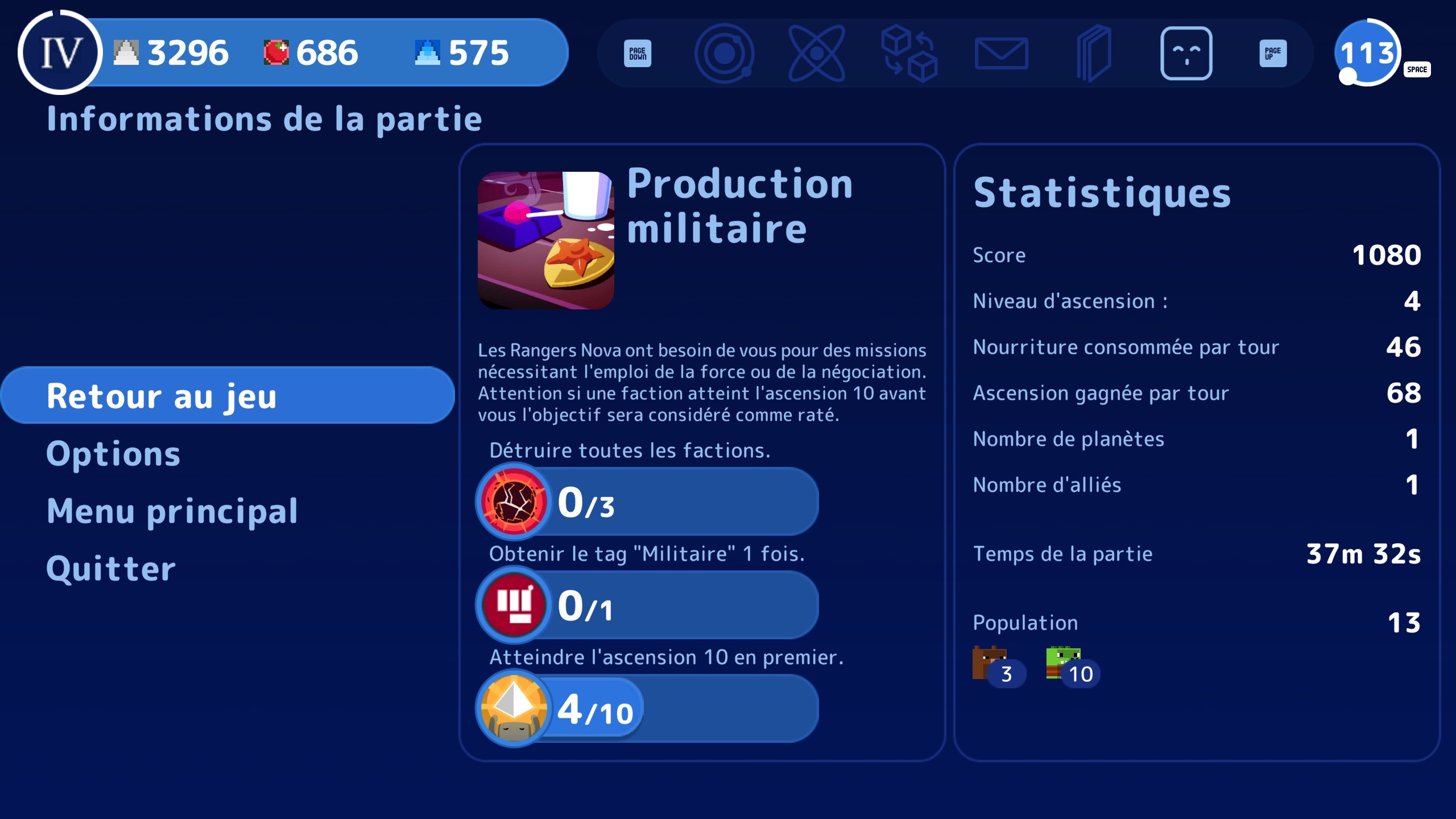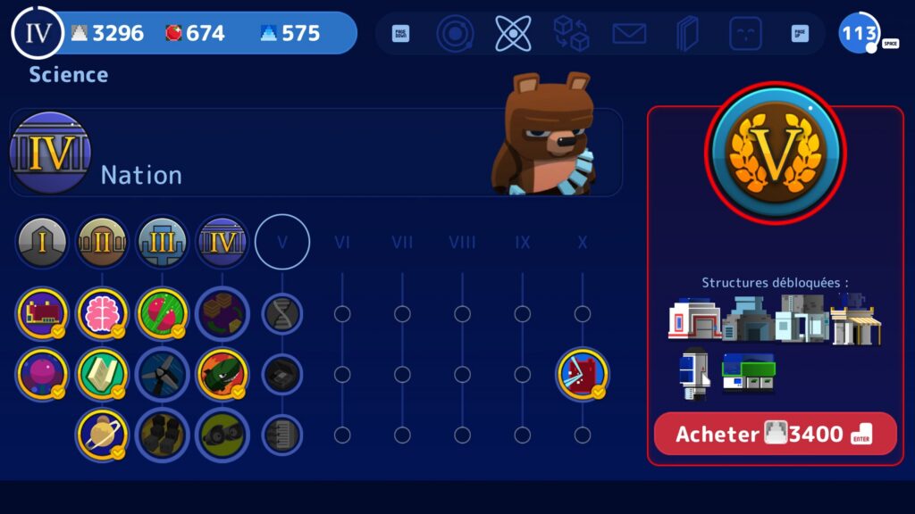 De plus, un arbre des technologie nous aidera, car deux types de points (gris et bleu pour ne pas perdre les lecteurs) vont aider. Les gris vont permettre les montées en niveau et vont servir pour faire des villageois, et l'autre sera pour acheter des évolutions de science qui donneront des bonus significatifs. Chaque palier se débloque en fonction de nos actions et personnages, ainsi qu'avec le temps qui passe. Cela peut être long et fastidieux sur la fin, mais on peut s'occuper en optimisant les zones, en trouvant de nouvelles planètes ou simplement en s'occupant des autres factions.