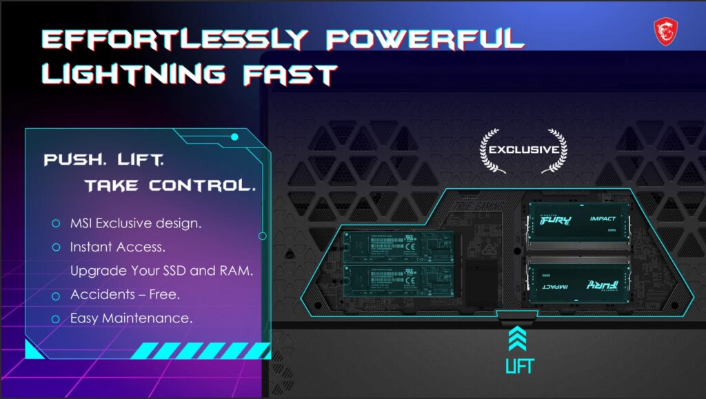 Enfin, MSI a introduit un nouveau design facilitant l’accès à la mémoire et au stockage, via un système permettant d’atteindre ces composants après le retrait de quelques vis, tel que présenté lors du showcase.