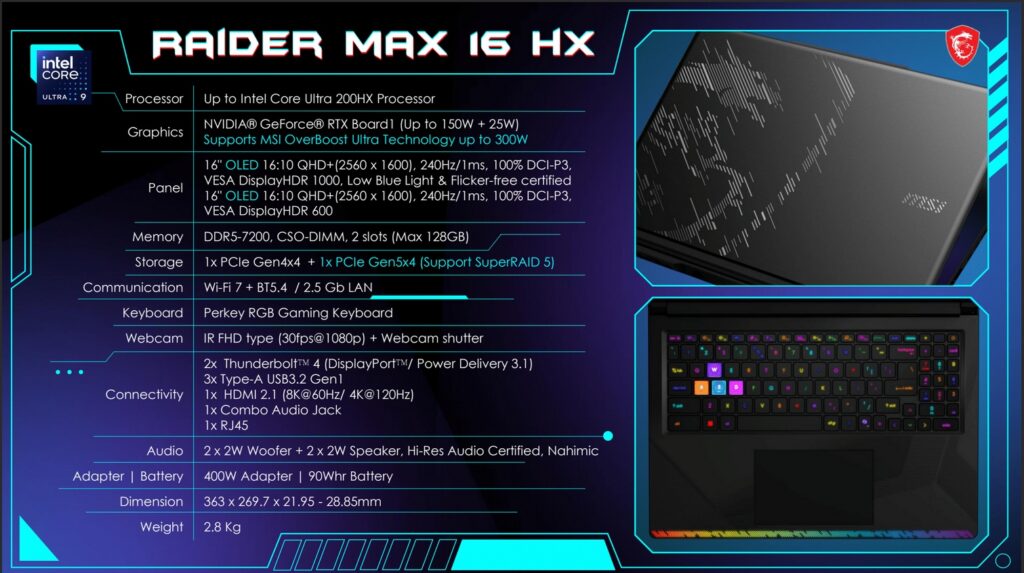 Lors de ce showcase, MSI a notamment présenté le Raider MAX 16 HX, dont les caractéristiques annoncées figurent ci-dessous.