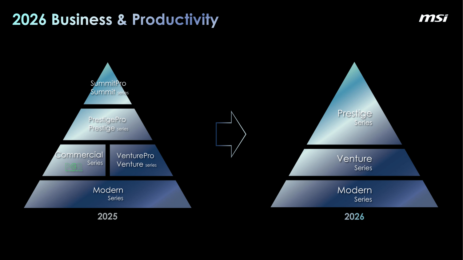 Plusieurs évolutions concernent cette gamme, notamment sur le plan organisationnel. MSI a en effet fait le choix de renforcer la lisibilité de son offre en simplifiant le positionnement de ses catégories de produits, comme illustré ci-dessous.