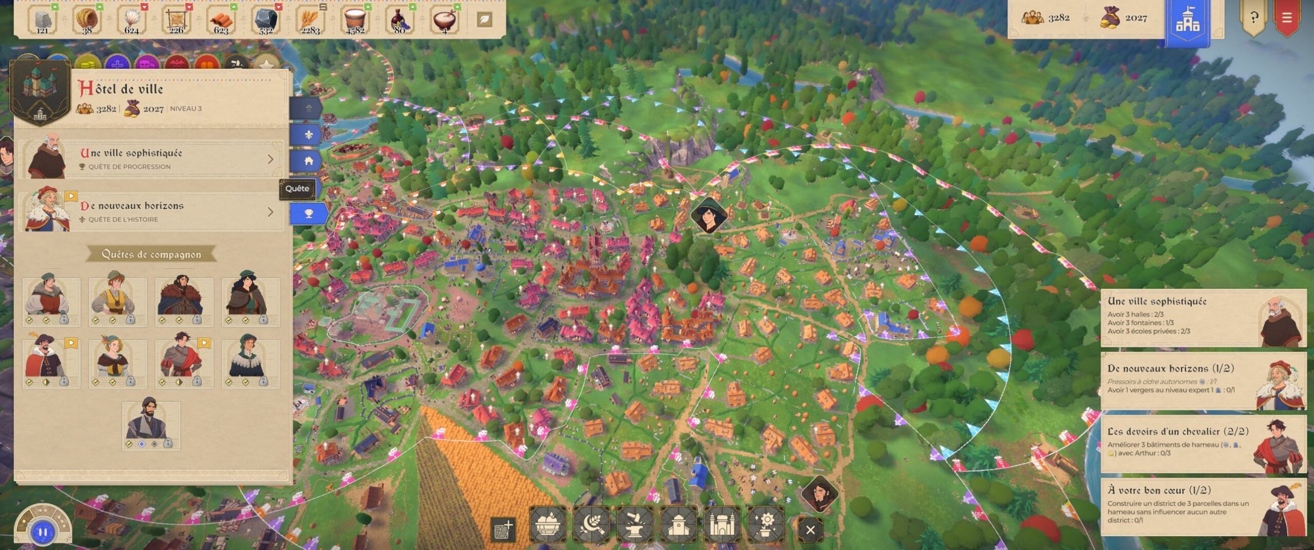 La progression est encadrée par des objectifs grâce à un Conseiller qui guide l’avancée. Ses quêtes débloquent au fur et à mesure des bâtiments et des mécaniques.