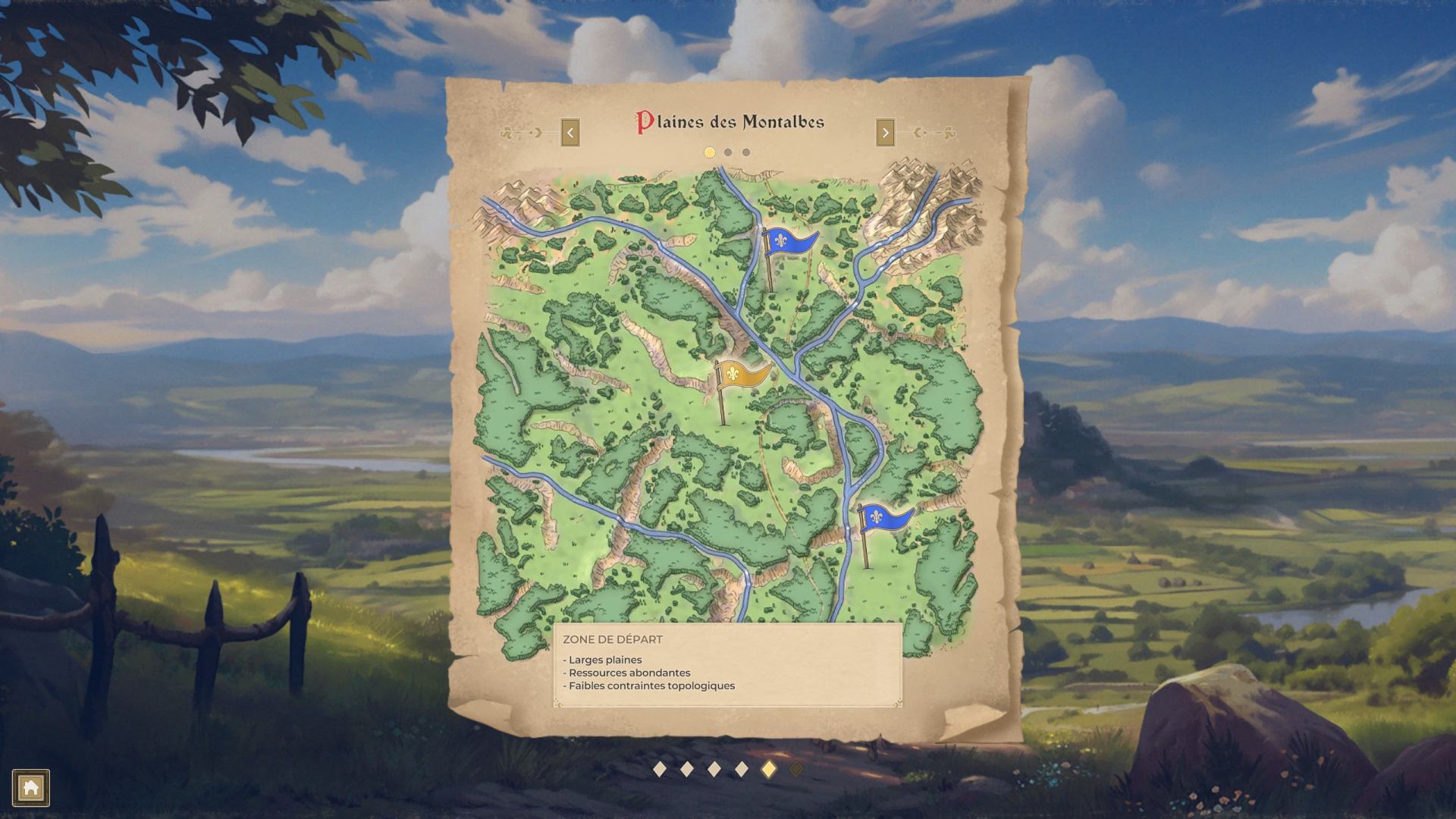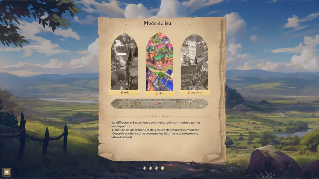 Avant de débuter, il convient de choisir la zone où s'installer ainsi que la difficulté. Il en existe trois : Barde, Colon et Conseiller.