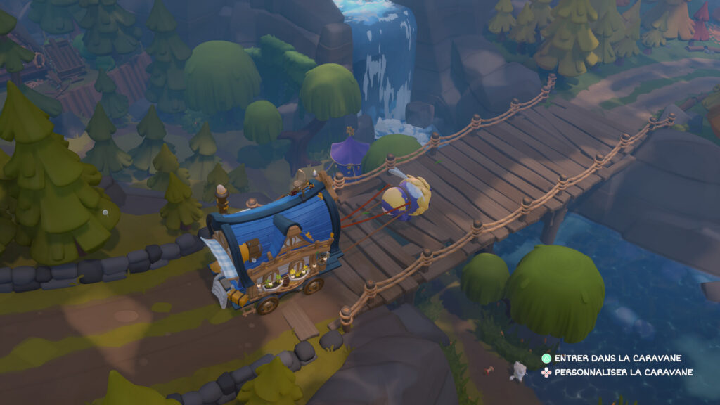 Sa structure de jeu est à la fois simple et étonnamment satisfaisante. La boucle principale s’articule autour d’un cycle hebdomadaire : pendant la semaine, on explore, on récolte des ressources, on cuisine, on fabrique des objets et on accepte de petites requêtes des habitants. Le week‑end, on installe sa caravane sur la place du village pour tenir un marché, vendre ses préparations et répondre aux commandes des clients. Cette alternance entre préparation et vente, entre le calme de la collecte et l’effervescence (somme toute relative) du marché crée un rythme naturel qui pousse à enchaîner les journées sans s’en rendre compte.