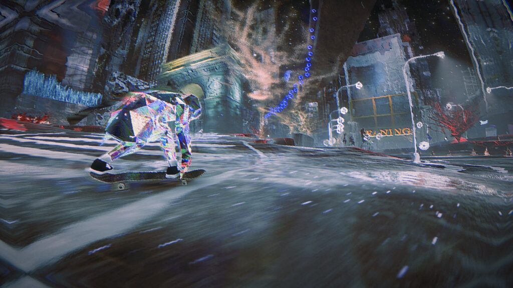 Un simple coup d'œil aux images ou à la bande-annonce suffit à comprendre que la grande claque vient de sa direction artistique. Notre héros, tout en verre, diffracte la lumière à chaque mouvement, et va transformer chaque tricks en explosions de reflets et de particules colorées. Les environnements ne sont pas en reste, ressemblant à une ville nocturne qui aurait basculé dans un rêve halluciné : les rues sont désertes, les enseignes demeurent lumineuses, l'architecture défie les lois de la gravité, et des espèces de créatures de cristal flottent dans la brume. On a constamment l'impression de progresser dans une galerie d’art délirante, à mi-chemin entre cauchemar urbain et trip sous acides.