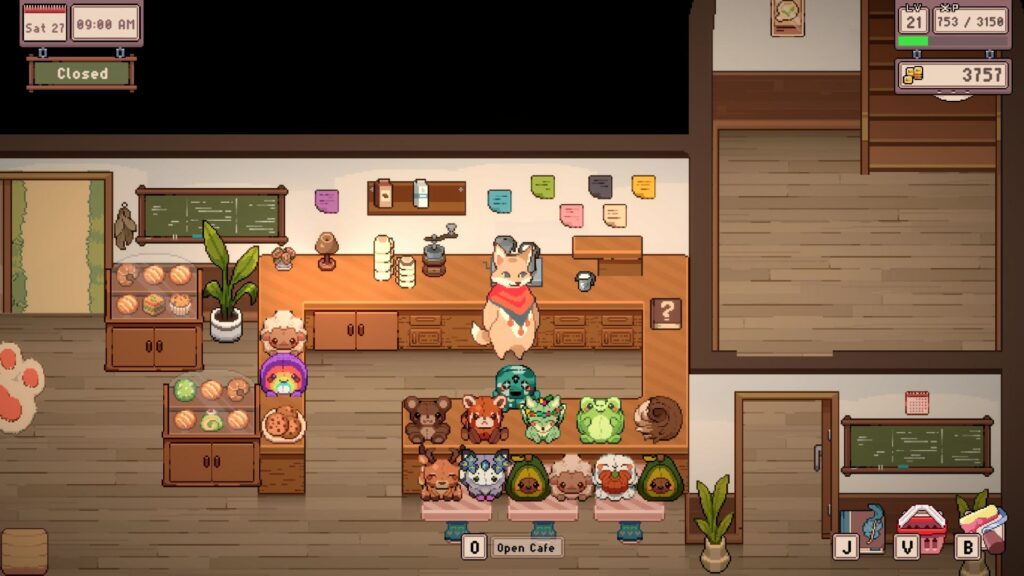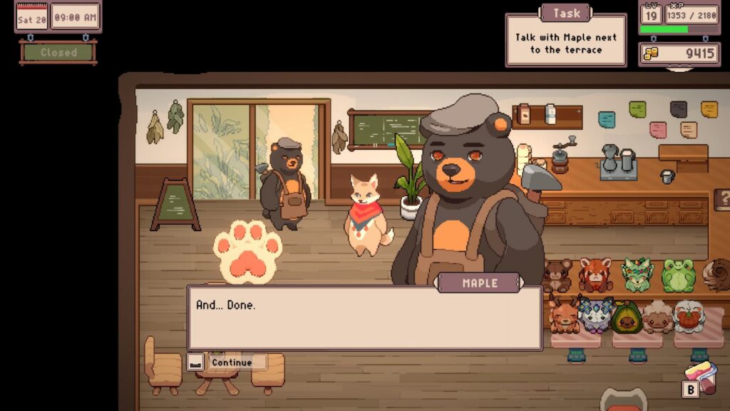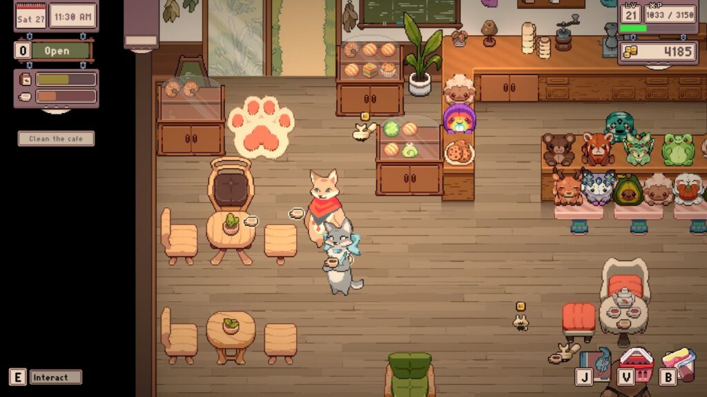 Les clients sont plutôt atypiques, avec une oie qui adore les fleurs, un ours charpentier ou encore une lapine pâtissière. De petits êtres facétieux se promènent dehors, dans le jardin, sur la terrasse ou dans la rivière sur des nénuphars transformés en bateaux. Nénuphars qui, d'ailleurs, donnent quelques points d'expérience en étant ramassés pour donner un but.