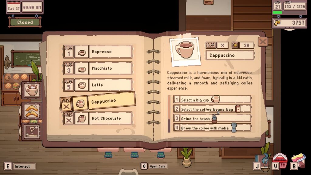 Au début, les choses sont simples, il n'y a qu'un expresso de disponible. Il faut pour ça moudre les grains de café, les mettre dans une bouilloire, faire chauffer, sortir une petite tasse, verser le café chaud, puis valider. Mais, très vite, grâce aux points à investir dans le livre de recettes, d'autres boissons se rajoutent. J'en ai pour le moment cinq, ayant appris à concocter le macchiato, le latte, le cappuccino et le chocolat chaud. Au début, je galérais à retenir les recettes, car elles ne représentaient rien pour moi. J'en suis même arrivée à me faire des notes, sur mon second écran :
