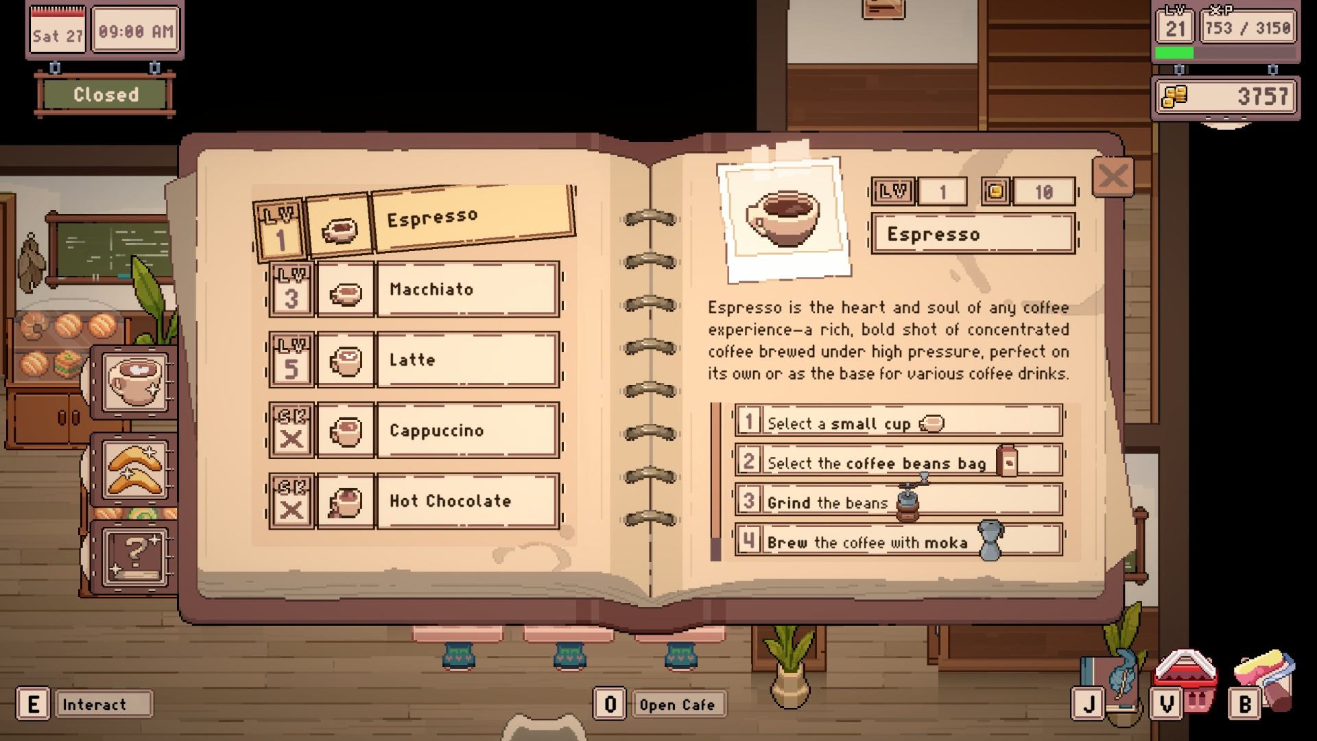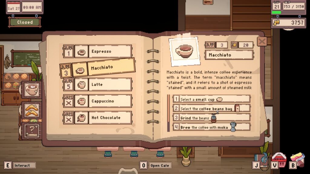 Au début, les choses sont simples, il n'y a qu'un expresso de disponible. Il faut pour ça moudre les grains de café, les mettre dans une bouilloire, faire chauffer, sortir une petite tasse, verser le café chaud, puis valider. Mais, très vite, grâce aux points à investir dans le livre de recettes, d'autres boissons se rajoutent. J'en ai pour le moment cinq, ayant appris à concocter le macchiato, le latte, le cappuccino et le chocolat chaud. Au début, je galérais à retenir les recettes, car elles ne représentaient rien pour moi. J'en suis même arrivée à me faire des notes, sur mon second écran :