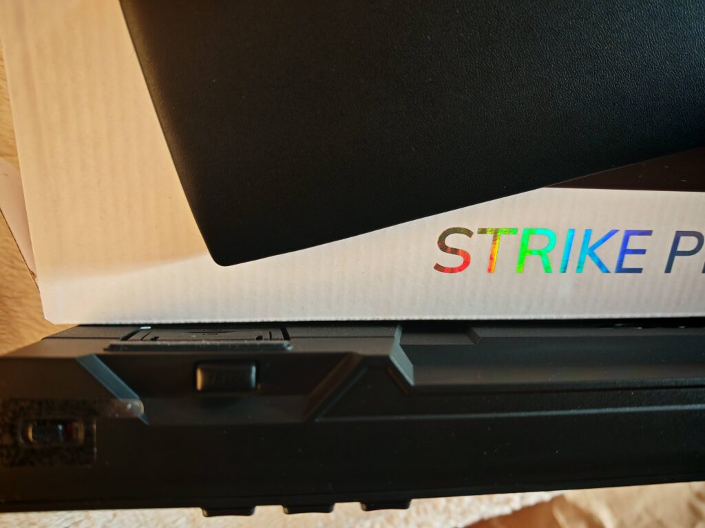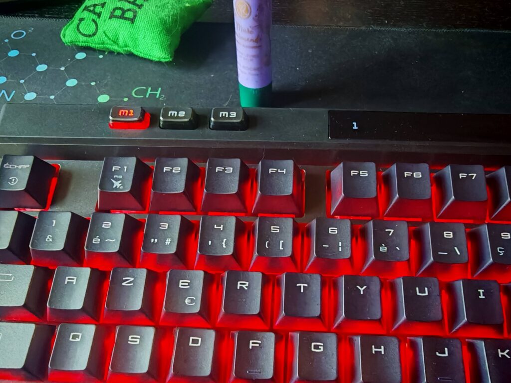 Visuellement, le MSI Strike Pro Wireless ne me charme pas, contrairement aux précédents modèles de la marque que j'ai pu tester. Les touches « M1, M2, M3 », la bande d'affichage et les trois dernières touches sur le haut font un peu tâche. Leur rétroéclairage ne peut pas être configuré.