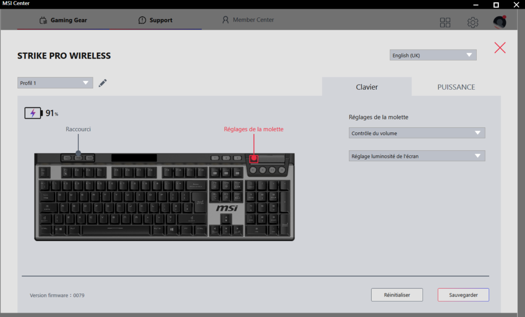 La configuration est relativement simple, après tout ce n'est pas la première fois que j'ai affaire à MSI Center. Avant de personnaliser le clavier, une petite mise à jour du firmware s'impose. Ceci fait, plusieurs possibilités sont affichées. Les touches M1, M2, M3 peuvent servir à changer de profil mais pas que. De même pour la molette.