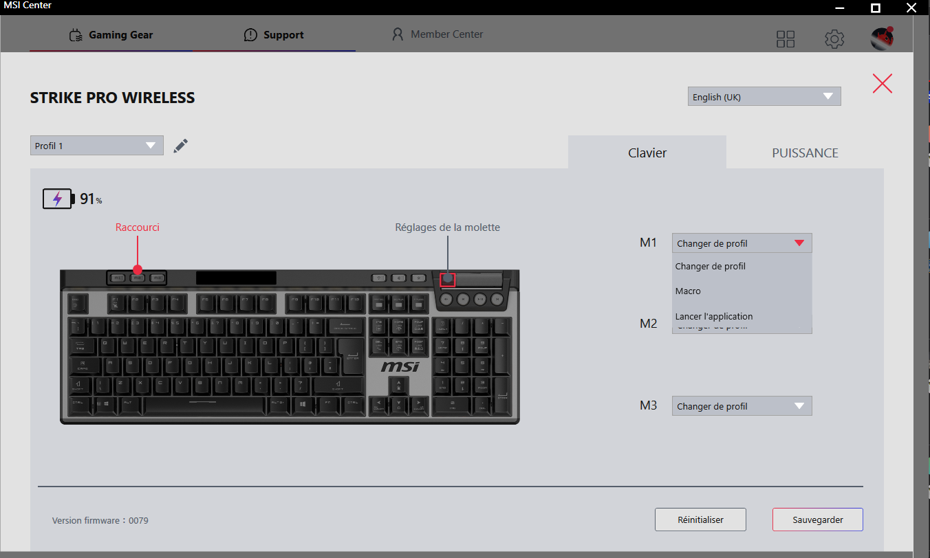 La configuration est relativement simple, après tout ce n'est pas la première fois que j'ai affaire à MSI Center. Avant de personnaliser le clavier, une petite mise à jour du firmware s'impose. Ceci fait, plusieurs possibilités sont affichées. Les touches M1, M2, M3 peuvent servir à changer de profil mais pas que. De même pour la molette.