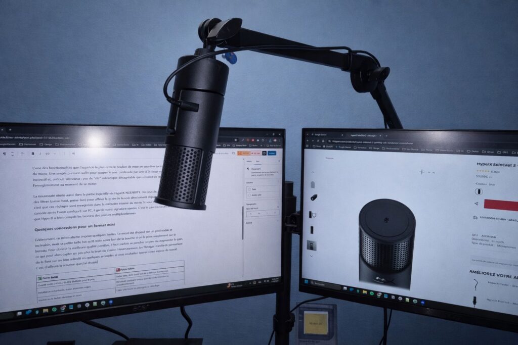Évidemment, ce minimalisme impose quelques limites. Le micro est disposé sur un pied stable et inclinable, mais sa petite taille fait qu'il reste assez loin de la bouche si on le pose simplement sur le bureau. Pour obtenir la meilleure qualité possible, il faut parfois se pencher un peu ou augmenter le gain, ce qui peut alors capter un peu plus le bruit du clavier. Heureusement, les filetages standards permettent de le fixer sur un bras articulé en quelques secondes si vous souhaitez épurer votre espace de travail. C'est d'ailleurs la solution que j'ai choisie.