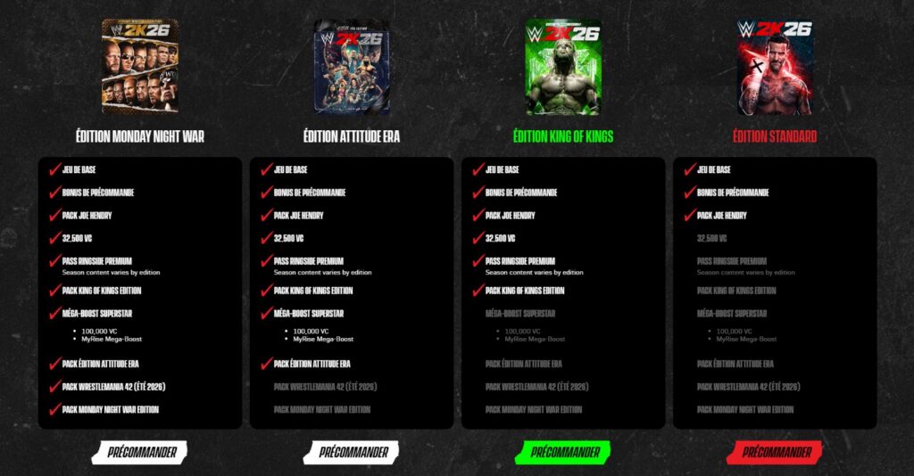 Pour cette année, l'offre de précommande est particulièrement dense, structurée autour de quatre paliers principaux. L'édition Standard (79,99 €) inclut le pack Joe Hendry en bonus de précommande. Pour ceux qui recherchent davantage de contenu historique, l'édition King of Kings (99,99 €) ajoute des versions rétros de Triple H et Stephanie McMahon.