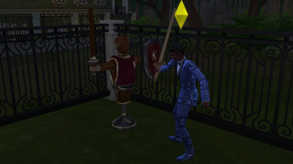 Autre loisir qui s'est rajouté : le combat à l'épée. L'entraînement s'effectue sur des mannequins, à installer dans son jardin (ou à retrouver à plusieurs endroits dans la zone).