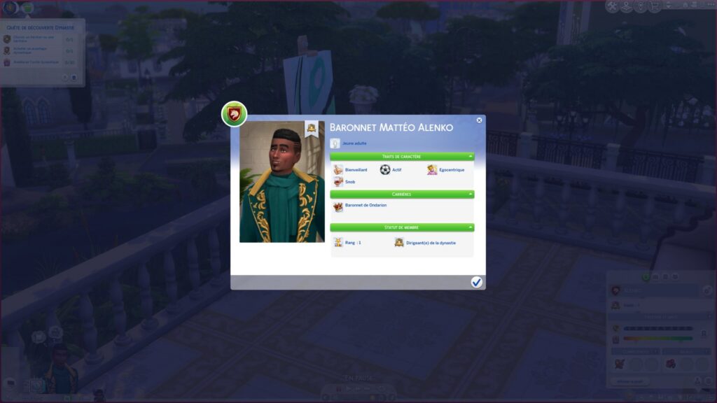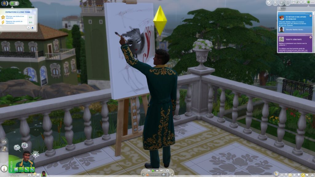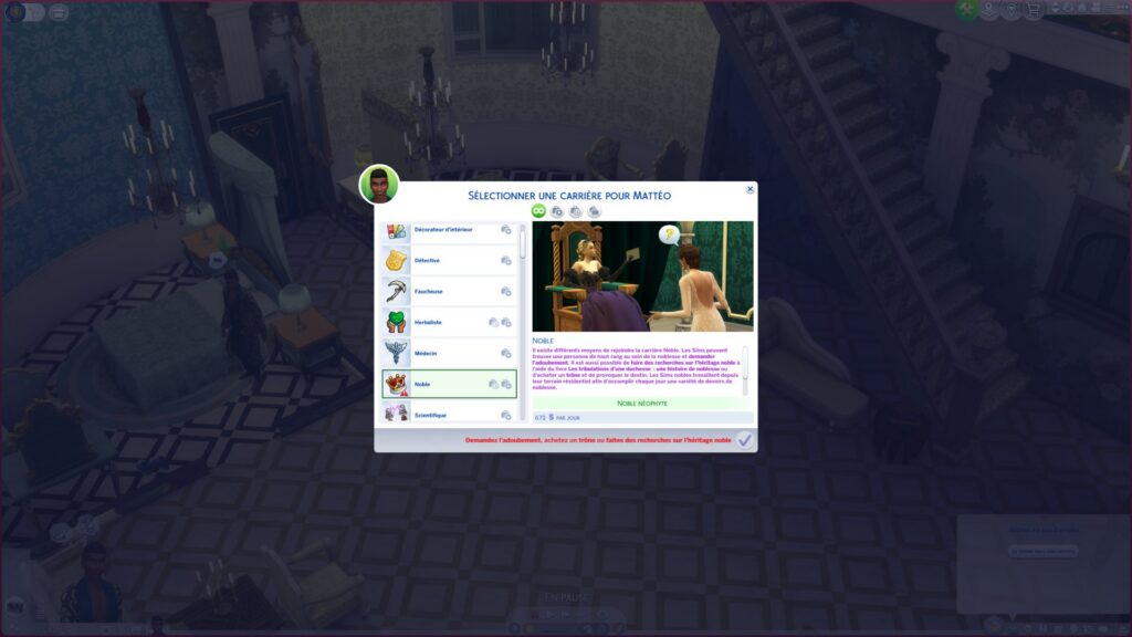 Mon Sim n'était pas noble à sa création. Pour revendiquer son titre, Mattéo passe par une carrière. Aussi simple que ça ! La progression suit ce qu'on a l'habitude avec des objectifs quotidiens à atteindre et des activités à effectuer pour accumuler de l'expérience. Après une bonne performance, la possibilité d'obtenir une promotion, ou plutôt ici de monter en rang.