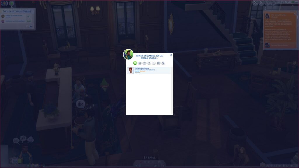 J'ai par contre subi pas mal de bugs... pas tous liés spécifiquement aux nouveautés, mais au jeu en général. J'ai eu un plantage, et rien n'a été sauvegardé de la soirée. Mon Sim errait régulièrement, bloqué au milieu d'une pièce, à ne plus accepter aucun ordre. Il a conservé sa honte du scandale pendant des semaines, le décompte se réinitialisait constamment. Mattéo avait beau être ami avec son rival, et passer ses journées en sa compagnie, le debuff ne sautait pas.