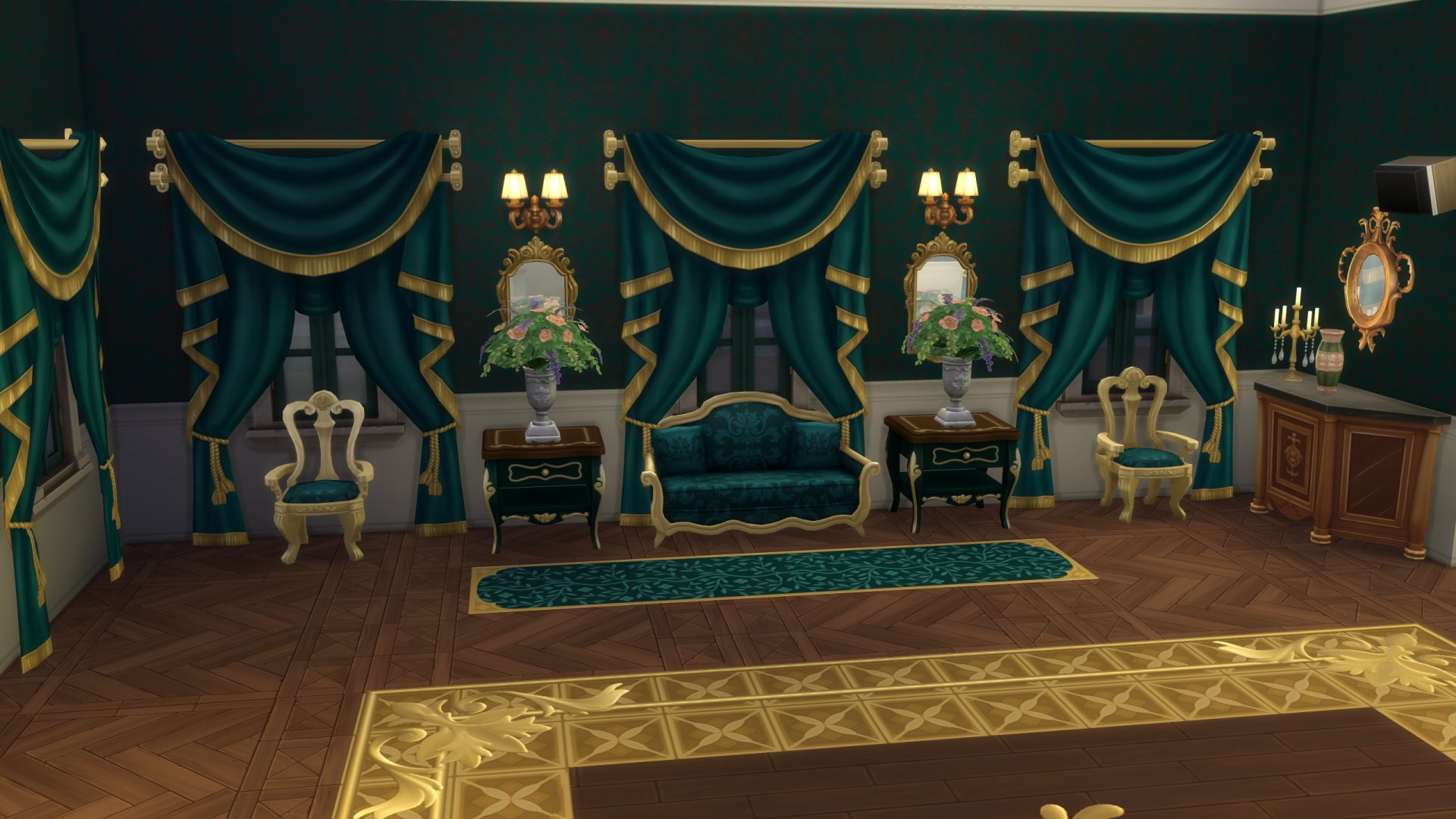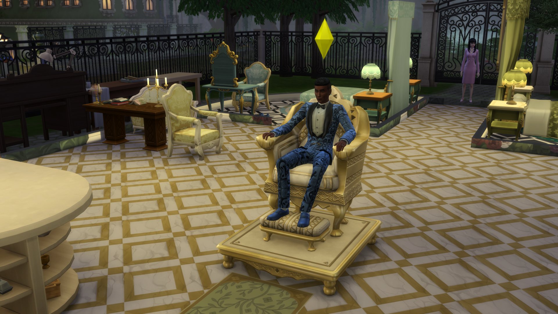 Du côté des meubles (car bien sûr j’ai ensuite enchaîné avec la création d’un domicile) l’ensemble affiche une esthétique résolument royale. Les pièces mêlent influences nord-africaines, orientales et classiques européennes. Deux inspirations se distinguent : le style baroque Renaissance, avec ses dorures, et l’inspiration berbère, reconnaissable à ses motifs géométriques et à son bois sculpté.