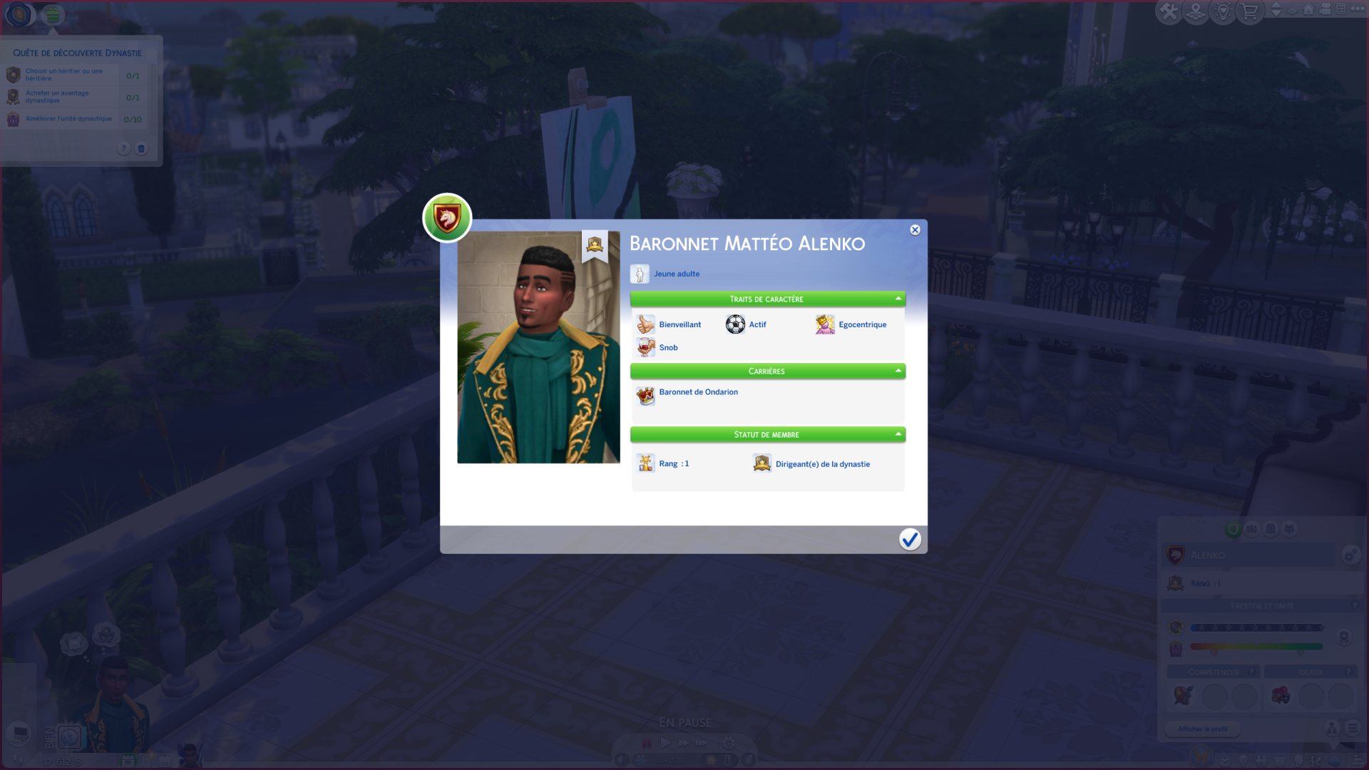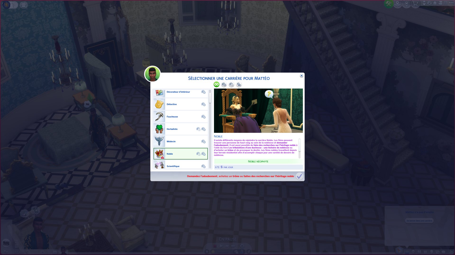 Mon Sim n'était pas noble à sa création. Pour revendiquer son titre, Mattéo passe par une carrière. Aussi simple que ça ! La progression suit ce qu'on a l'habitude avec des objectifs quotidiens à atteindre et des activités à effectuer pour accumuler de l'expérience. Après une bonne performance, la possibilité d'obtenir une promotion, ou plutôt ici de monter en rang.
